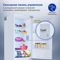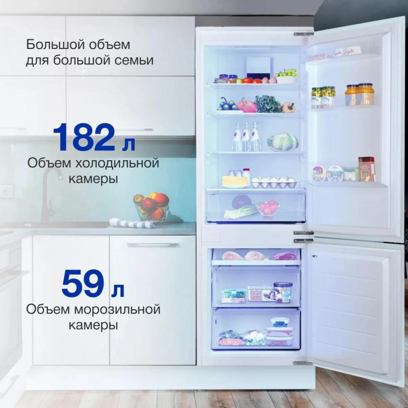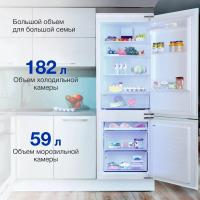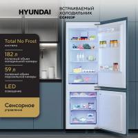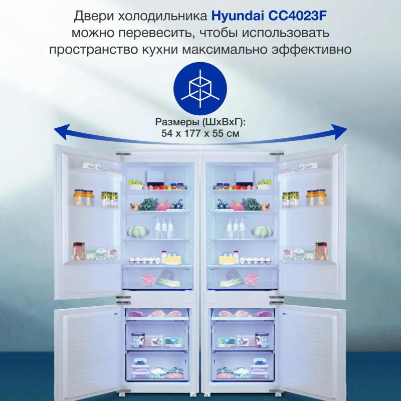 Холодильник HYUNDAI CC4023F с нижним расположением морозильной камеры имеет электронное управление и систему No Frost в обеих камерах. Общий объем составляет 241 литр, из которых 182 литра приходится на холодильное отделение и 59 литров на морозильное. В холодильной камере установлено 4 стеклянные полки и один ящик, в морозильной - одна полка и два ящика. Мощность замораживания достигает 4 кг/сутки, предусмотрена автономная работа до 20 часов при отключении электроэнергии. Прибор оснащен стандартным компрессором с хладагентом R600a, уровень шума составляет 41 дБ. Климатический класс N, ST, T позволяет использовать устройство в разных климатических условиях. Имеется функция защиты от детей. Габариты составляют 54x177x55 см, вес 55.5 кг. Требуемая ниша для встраивания: ширина 56-56.1 см, высота 177.6 см, глубина 55 см.