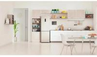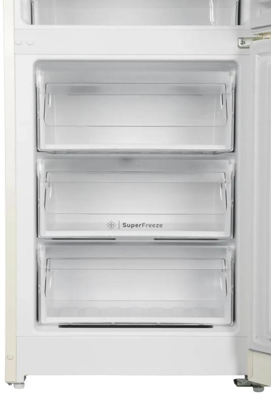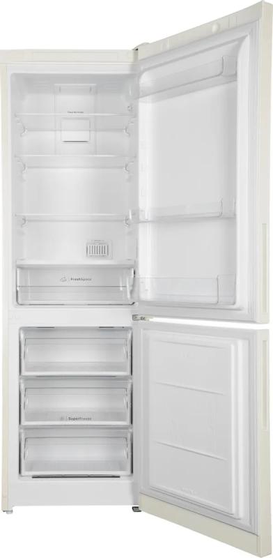 Холодильник INDESIT ITR 5180 E с электронным управлением и внешним дисплеем имеет двухкамерную конструкцию с нижним расположением морозильной камеры. Общий объем составляет 298 литров, из которых 220 литров приходится на холодильную камеру и 78 литров на морозильную. В обеих камерах реализована технология Total No Frost, исключающая необходимость размораживания. Холодильное отделение содержит 4 стеклянные полки и один ящик, морозильная камера оснащена тремя ящиками с мощностью замораживания до 4 кг/сутки. Предусмотрена функция суперзаморозки и звуковая индикация незакрытой двери. Уровень шума составляет 40 дБ, класс энергопотребления A, годовое потребление энергии 365 кВт*ч. При отключении электропитания поддерживает температуру до 14 часов. Используется хладагент R600a и один стандартный компрессор. Двери металлические с возможностью перевешивания, предусмотрено 3 полки на дверце. Корпус выполнен в бежевом цвете. Габариты модели составляют 60x185x64 см.
