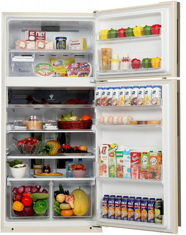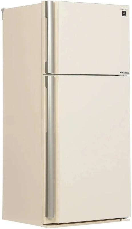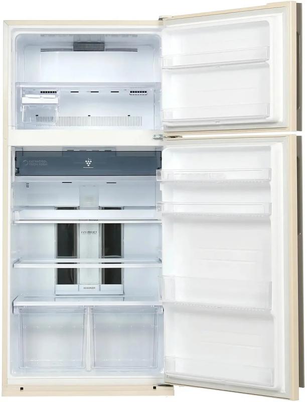 Холодильник SHARP SJ-XE55PMBE с электронным управлением имеет двухкамерную конструкцию и систему No Frost. Общий объем составляет 585 л, полезный - 536 л. Холодильная камера содержит 4 стеклянные полки и 2 ящика, ее объем 407/388 л. Морозильная камера расположена сверху, оснащена технологией Full No Frost, имеет объем 178/148 л и одну полку. Уровень шума 27 дБ, класс энергопотребления A++, годовое потребление 350 кВт*ч. Инверторный компрессор работает на хладагенте R600a. Функции включают суперзаморозку, суперохлаждение, механический ледогенератор и антибактериальный фильтр. Имеется звуковая индикация незакрытой двери и температуры. Дверь открывается направо, выполнена из металла бежевого цвета. Габариты 80х175х73.5 см, вес 74 кг.