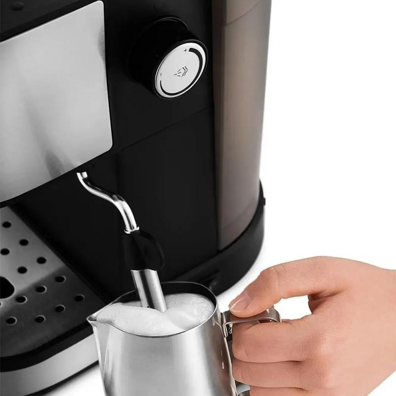 Кофеварка KITFORT КТ-753 — рожковая модель для приготовления эспрессо и капучино с использованием молотого кофе. Оборудована помпой с давлением 15 бар, резервуаром для воды объёмом 1 л (съёмный), функциями подачи пара и горячей воды, а также ручным капучинатором. Предусмотрена возможность одновременного приготовления двух порций. Управление механическое, имеется индикатор нагрева, пресс для утрамбовки кофе, съёмный поддон для капель. Корпус выполнен в сочетании чёрного цвета и нержавеющей стали. Длина сетевого кабеля — 0,7 м. Габариты: 18,5 × 28,5 × 30 см, вес — 2,7 кг.