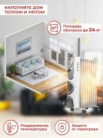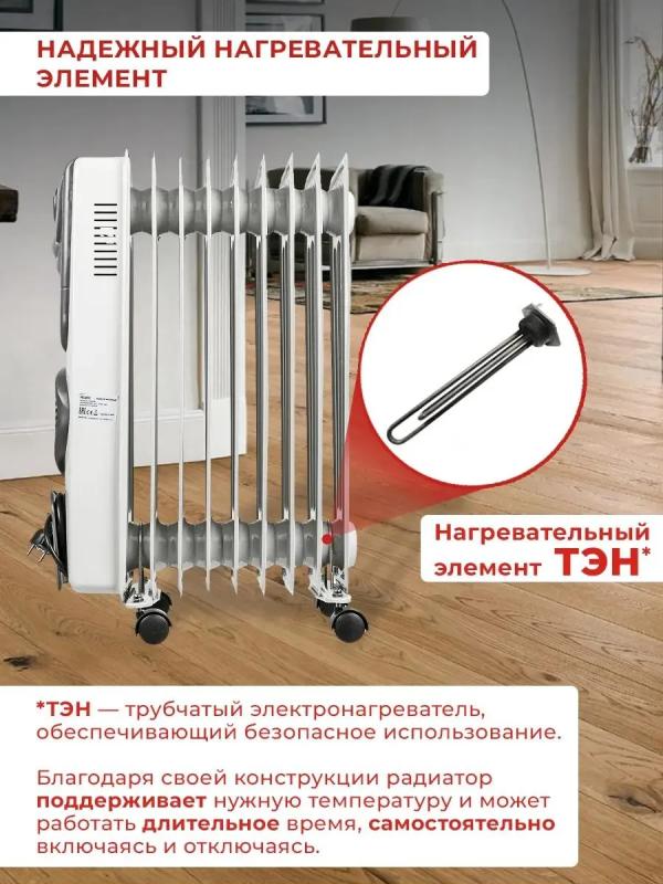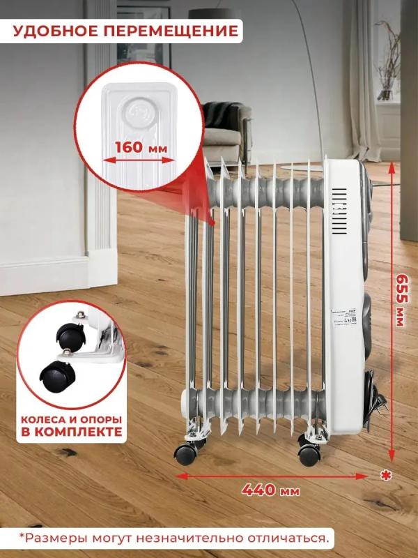 Масляный обогреватель РЕСАНТА ОМ-9АВ с мощностью 2400 Вт. Четыре режима работы: 800 Вт, 1200 Вт, 2000 Вт, 2400 Вт. Механическое управление. Термостат. Встроенный тепловентилятор. Защита от перегрева. Корпус из 9 секций радиатора белого цвета. Ролики для перемещения. Отсек для сетевого шнура. Размеры: 43х13х63 см. Вес: 8.63 кг.