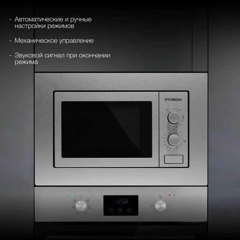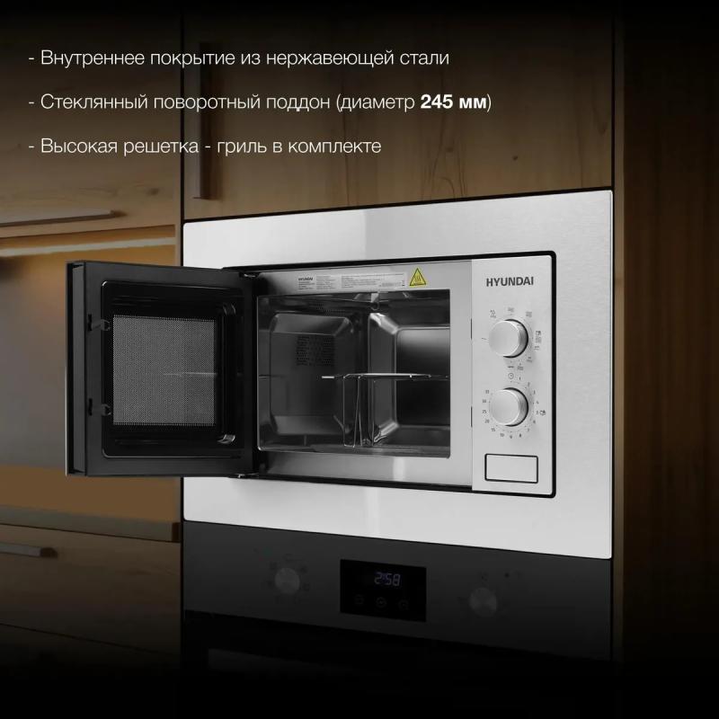 Микроволновая печь HYUNDAI HBW 2030 IX имеет объем 20 л и мощность микроволн 800 Вт, оснащена механическим управлением и кнопкой открывания дверцы справа налево, с внутренним покрытием камеры из нержавеющей стали, диаметром поворотного стола 245 мм, режимами автоматической разморозки, автоматического разогрева и грилем с мощностью 1000 Вт, дополнительными функциями микроволны+гриль, ускоренной разморозки и разогрева, инверторным управлением мощностью и задержкой пуска, комплектуется решеткой для гриля, цвет корпуса нержавеющая сталь, длина кабеля питания 1 м, размеры (ШхВхГ) 59.5 х 34.35 х 38.8 см, вес 15.45 кг.