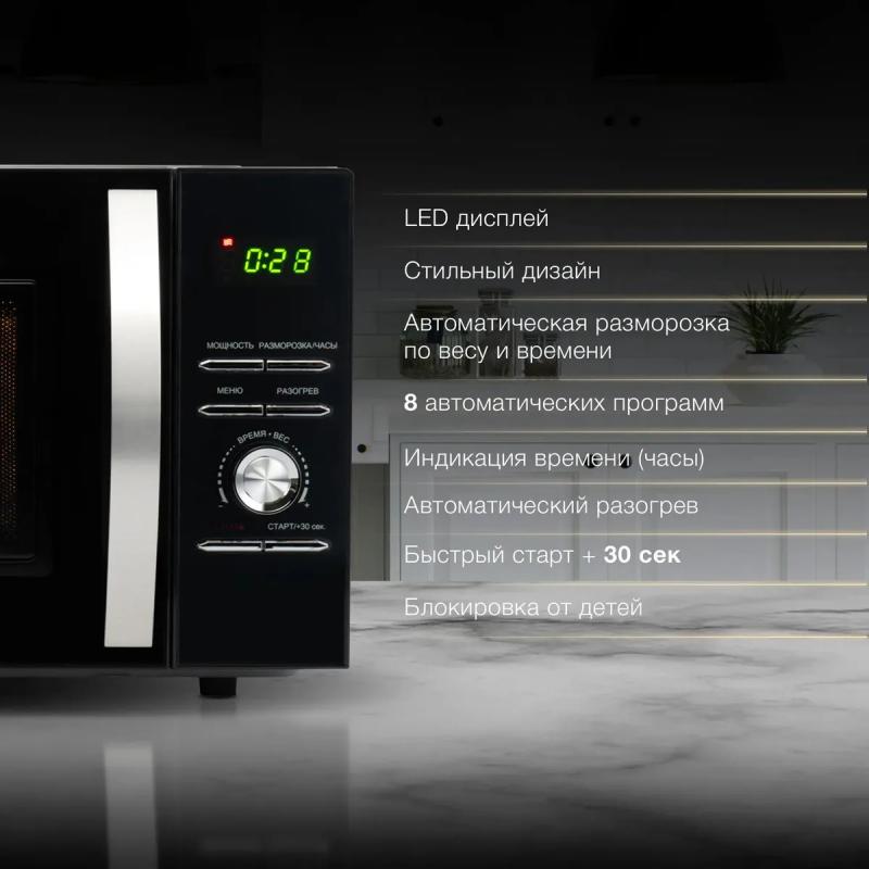 Микроволновая печь HYUNDAI HYM-D2079 имеет объем 23 л и мощность 800 Вт. Оснащена электронным управлением с механической ручкой для открывания дверцы справа налево. Включает дисплей, часы, функции быстрого старта, звукового сигнала, кнопку +30 секунд и 5 ступеней регулировки мощности. Внутренняя камера покрыта эмалью, диаметр поворотного стола составляет 270 мм. Предусмотрено 8 программ, включая автоматическую разморозку, разогрев, приготовление и соло режим. Дополнительные функции включают размораживание по весу, экспресс-режим, блокировку от детей, память рецептов и таймер до 60 минут. Габариты 48.0 х 29.3 х 35.2 см, вес 12 кг.