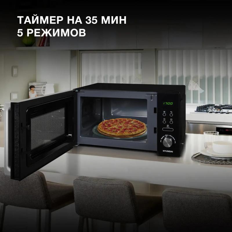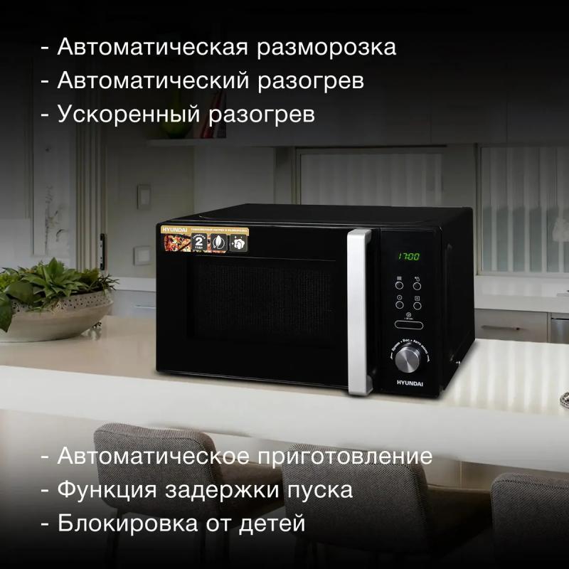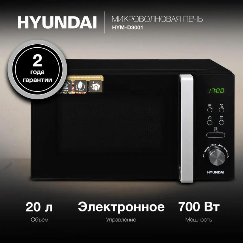 Микроволновая печь HYUNDAI HYM-D3001 имеет объем 20 л и мощность 700 Вт. Управление электронное с кнопкой +30 секунд. Дверца открывается справа налево с помощью ручки. На корпусе расположен дисплей. Предусмотрено 5 ступеней регулировки мощности. Внутреннее покрытие камеры выполнено из эмали. Диаметр поворотного стола составляет 255 мм. Гриль отсутствует. Режимы включают автоматическую разморозку, разогрев, приготовление и соло. Есть экспресс-режим приготовления. Функции представлены блокировкой от детей, памятью рецептов и программированием процесса приготовления. Цвет черный с хромом. Размеры 44.0 х 25.9 х 35.7 см. Вес 10.4 кг.