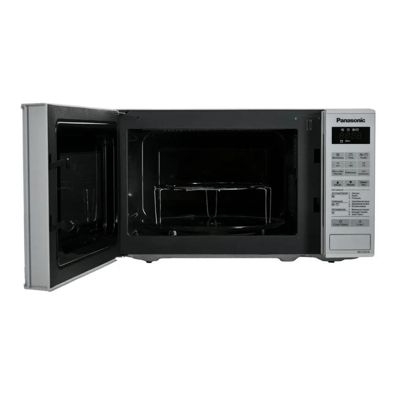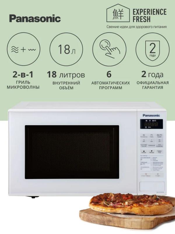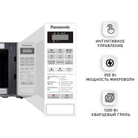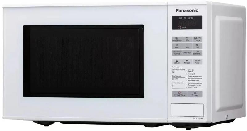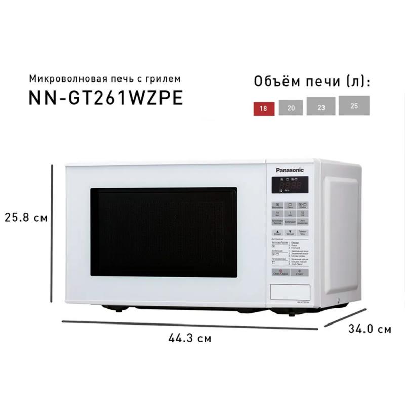 Микроволновая печь PANASONIC NN-GT261WZPE с объемом камеры 20 литров оснащена электронным управлением и кварцевым грилем мощностью 1000 Вт. Микроволновая мощность составляет 800 Вт с возможностью ее регулировки. Дверца открывается кнопкой справа налево. На корпусе расположен дисплей и часы. Внутренняя камера покрыта жаропрочной эмалью, диаметр поворотного стола равен 255 мм. Предусмотрены режимы автоматической разморозки, автоматического разогрева, автоматического приготовления и комбинированный режим микроволн+гриль. Имеется система равномерного распределения микроволн и функция ускоренной разморозки. Оборудована звуковым сигналом окончания приготовления, блокировкой от детей и возможностью программирования процесса приготовления. В комплект входит решетка для гриля. Цвет белый. Размеры прибора составляют 44.3 х 25.8 х 34 см, вес 12 кг.