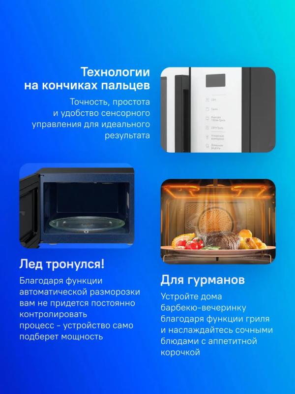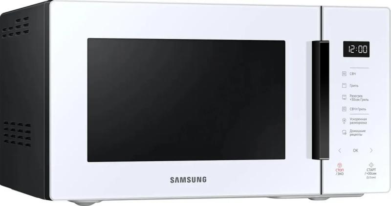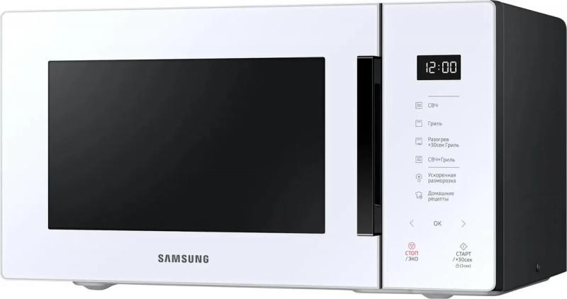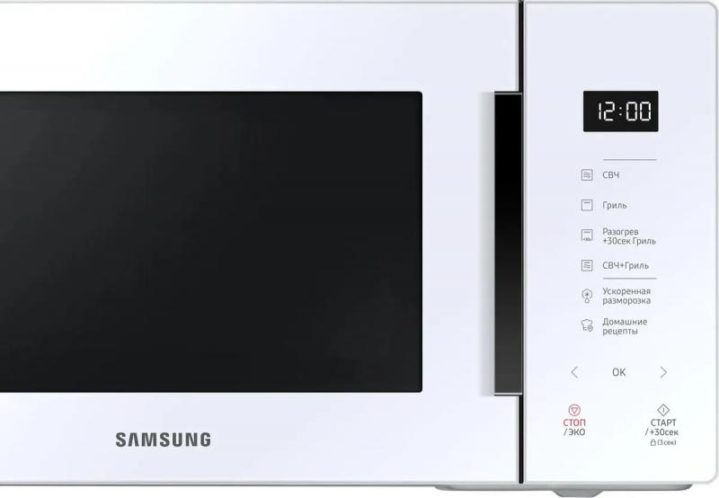 Микроволновая печь SAMSUNG MG23T5018AW/BW с сенсорным управлением и объемом 23 литра оснащена микроволнами мощностью 800 Вт и тэновым грилем на 1100 Вт. Имеет 6 уровней регулировки мощности и 17 автоматических программ, включая разморозку, разогрев и приготовление. Предусмотрены функции быстрого старта, отключения звука, паузы и кнопка добавления 30 секунд. Особенностью модели является встроенная поваренная книга с множеством автопрограмм под названием "Домашние рецепты". Внутреннее покрытие выполнено из биокерамической эмали, диаметр поворотного стола составляет 288 мм. Дверца открывается справа налево с помощью ручки. На корпусе расположен дисплей с часами. Модель имеет систему равномерного распределения микроволн, режим комбинированной работы микроволн и гриля, а также функцию блокировки от детей. Цвет белый. Размеры внешние 48.9 х 27.5 х 38.1 см, внутренние размеры камеры 33 х 21.1 х 32.4 см. Вес 12.7 кг.