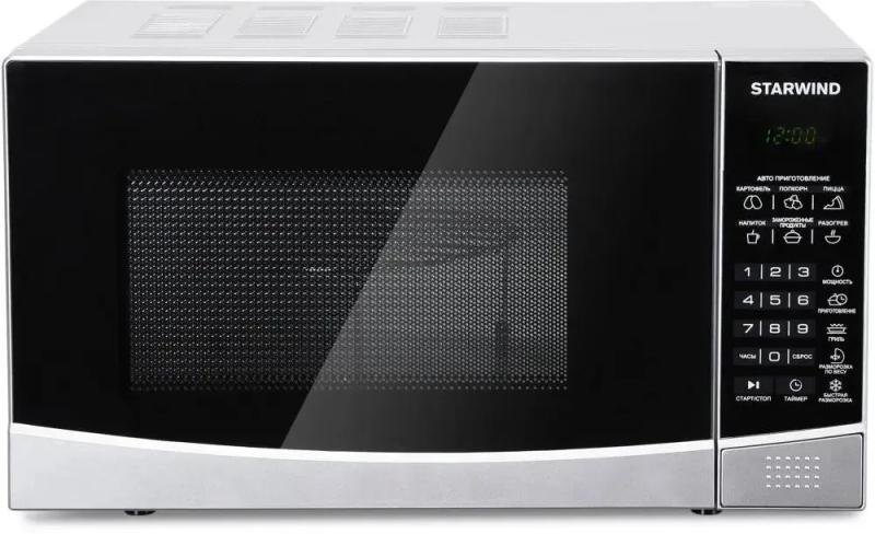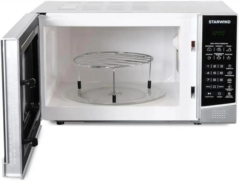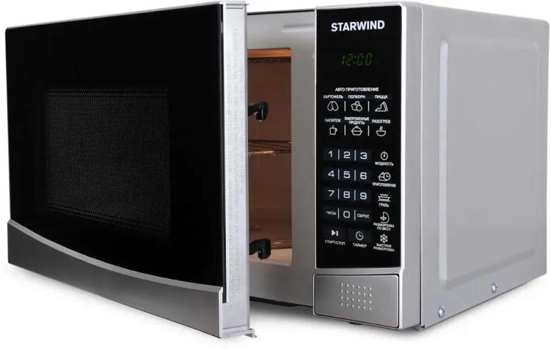 Микроволновая печь STARWIND SMW2820 с объемом 20 л и мощностью микроволн 700 Вт оснащена электронным управлением, системой открывания дверцы кнопкой справа-налево, дисплеем, часами и регулировкой мощности, имеет внутреннее покрытие камеры из эмали легкой очистки, диаметр поворотного стола 245 мм, режимы автоматической разморозки, автоматического разогрева, автоматического приготовления, гриль, дополнительные функции размораживания по весу, комбинированного режима микроволны+гриль и ускоренной разморозки, комплектуется решеткой для гриля, цвет серебристый/черный, размеры (ШхВхГ) 45.2 х 26.2 х 32.7 см, вес 11.3 кг.