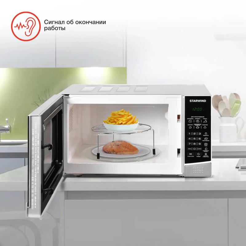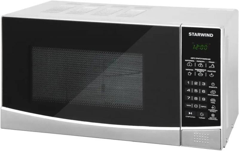 Микроволновая печь STARWIND SMW3120 с объемом 20 л и мощностью микроволн 700 Вт оснащена электронным управлением, кнопкой открывания дверцы справа-налево, дисплеем, часами и системой регулировки мощности. Внутреннее покрытие камеры выполнено из эмали легкой очистки, диаметр поворотного стола составляет 245 мм. Мощность тэнового гриля равна 850 Вт, доступны режимы автоматической разморозки, разогрева, приготовления, микроволны+гриль, экспресс-режимы и функции блокировки от детей, памяти рецептов, программирования процесса приготовления. Комплект включает решетку для гриля. Размеры (ШхВхГ): 45.2 х 26.2 х 32.7 см, вес: 11.3 кг.