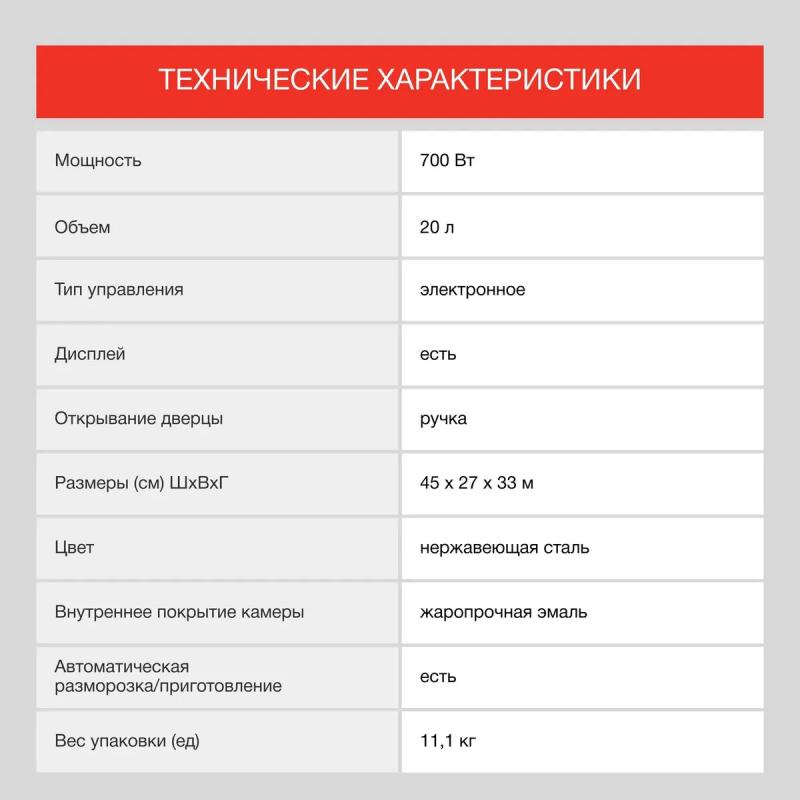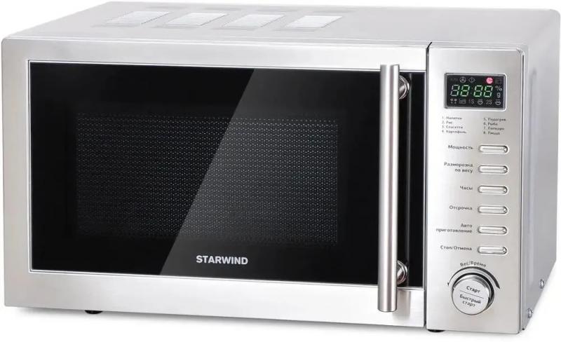 Микроволновая печь STARWIND SMW5220 имеет объем 20 литров и мощность 700 Вт. Управление электронное, дверца открывается справа налево с помощью ручки. На корпусе расположен дисплей и часы. Предусмотрен быстрый старт и возможность регулировки мощности. Внутренняя камера покрыта жаропрочной эмалью. Модель оснащена режимом автоматической разморозки, функцией автоматического приготовления и режимом соло. Есть дополнительный режим размораживания по весу. Цвет нержавеющая сталь. Размеры устройства составляют 45 х 27 х 33 см.