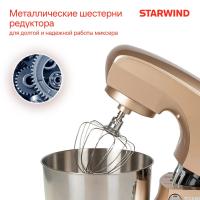 Планетарный миксер STARWIND SPM5181 имеет мощность 1300 Вт и обеспечивает 10 скоростных режимов работы. Модель оснащена импульсным режимом и обеспечивает скорость вращения 200 об/мин. Объем чаши из нержавеющей стали составляет 5.5 л, максимальная загрузка продуктов - 1.5 кг. Корпус изготовлен из пластика, имеются прорезиненные ножки для устойчивости. Безопасность использования подтверждена классом защиты II. В комплект входят три насадки: венчик для взбивания, крюки для теста и лопатка для перемешивания. Также поставляется защитный обод и книга рецептов. Длина электрического кабеля составляет 1.3 м. Цвет модели золотистый. Габариты устройства 238 х 317 х 387 мм, вес 4.85 кг.