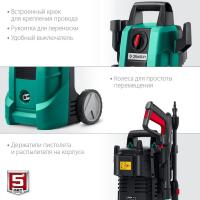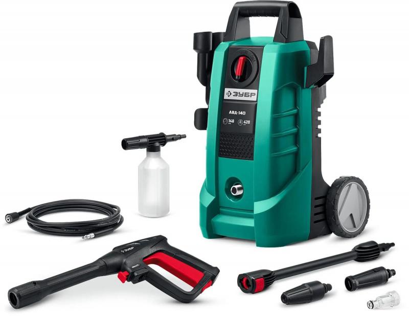 Мойка высокого давления ЗУБР АВД-140 с электрическим щеточным двигателем мощностью 1700 Вт обеспечивает давление от 90 до 140 бар. Устройство оснащено внешним баком для чистящего средства объемом 0.7 л, струйной трубкой Vario-Power и турбонасадкой. В комплекте: пистолет, пеногенератор, шланг высокого давления длиной 5 м, сетевой кабель 5 м с автоматической намоткой, фильтр и другие аксессуары. Входной шланг с резьбой 3/4". Вес устройства без принадлежностей: 6.3 кг.