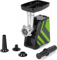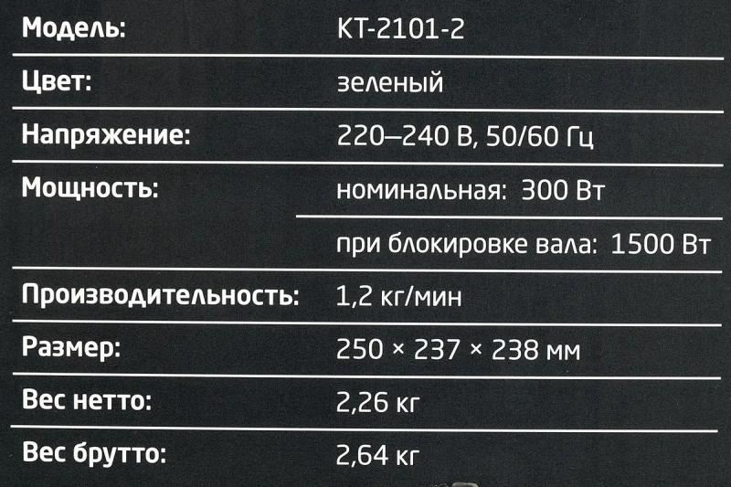 Мясорубка KITFORT КТ-2101-2 работает от электросети и имеет мощность 300 Вт при нормальной работе и 1500 Вт при блокировке вала. Производительность устройства составляет 1.2 кг/мин. Модель оснащена одной скоростью и функцией реверса. Защита от перегрева обеспечивает безопасную работу. В комплект входят перфорированные диски для фарша с отверстиями 5 и 7 мм, насадка для колбас, насадка для кеббе и толкатель. Корпус и лоток выполнены из пластика зеленого цвета. Модель имеет прорезиненные ножки и сетевой шнур длиной 0.93 м. Размеры мясорубки составляют 238 х 307 х 138 мм, вес 2.3 кг.