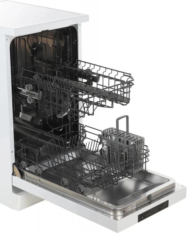 Посудомоечная машина GORENJE GS520E15W с узким корпусом и напольной установкой оснащена конденсационной системой сушки. Модель имеет 5 программ мойки, включая БИО, интенсивную, экономичную и экспресс-программу. Предусмотрен режим предварительного ополаскивания. Вместимость составляет 9 комплектов посуды. Внутреннее пространство организовано с помощью двух корзин, полок для кружек, складных держателей тарелок и регулируемой по высоте верхней корзины. Машина оборудована двумя разбрызгивателями и системой AquaStop для защиты от протечек. Температурные режимы варьируются от 35 до 65 градусов. Управление электронное с индикацией наличия соли и ополаскивателя. Расход воды достигает 9 литров за цикл. Уровень шума составляет 47 дБ. Классы эффективности: мойка A, сушка A, энергопотребление A++. Максимальная мощность 1850 Вт. Габариты (ШхВхГ) 44.8х84.5х60 см, вес 36.5 кг.