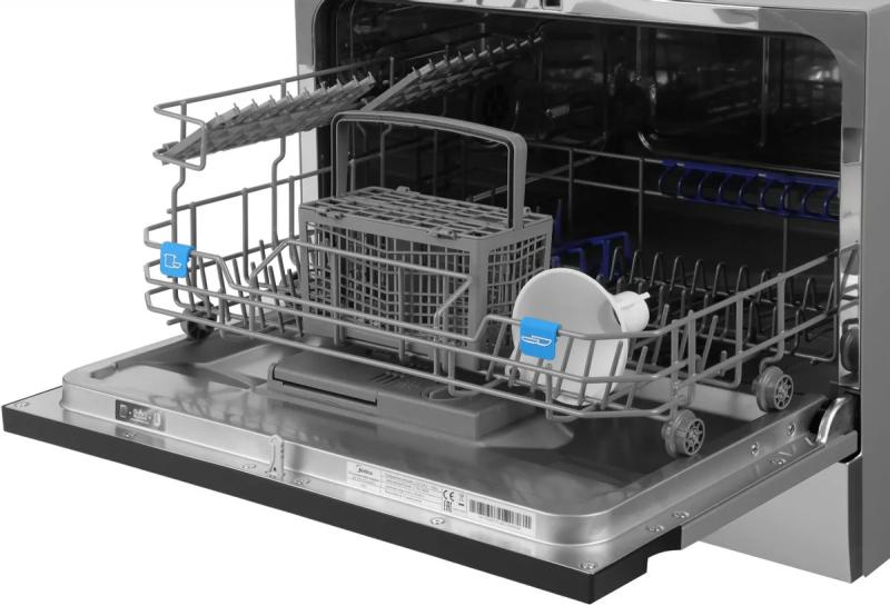 Компактная настольная посудомоечная машина MIDEA MCFD55S460Si оснащена электронным управлением и черным дисплеем. Вмещает 6 комплектов посуды, имеет одну корзину и полки для кружек. Предусмотрено 7 программ мойки: авто, интенсивная, стандартная, быстрая, ECO, 90-минутная и для стекла. Реализованы функции защиты от детей, таймера отсрочки запуска до 24 часов и совместимость с голосовым помощником Алиса через экосистему Яндекс. Машина оборудована самоочищающимся фильтром. Классы энергопотребления A+, мойки A, сушки A. Максимальный расход воды составляет 6.5 л, уровень шума - 49 дБ. Потребляемая мощность - 1380 Вт, питание осуществляется от сети 220-240 В, 50 Гц. Размеры прибора 55х43.8х50 см, вес 20.15 кг.
