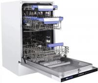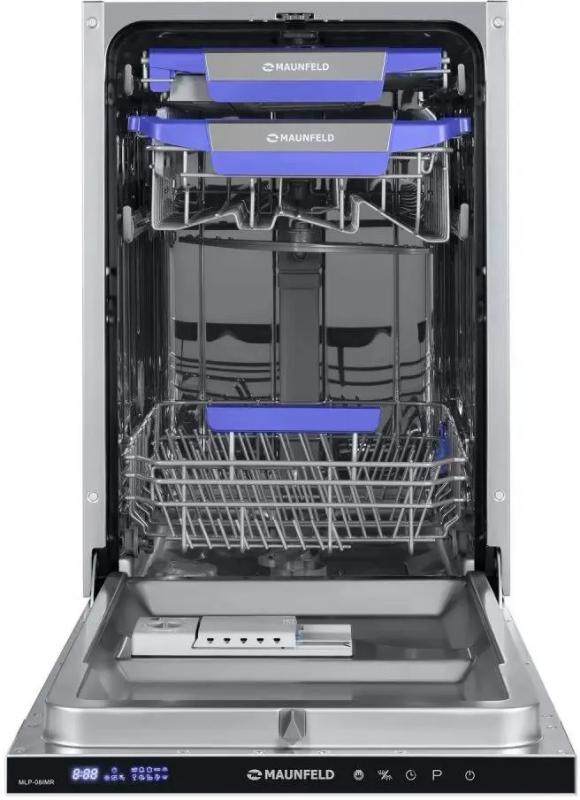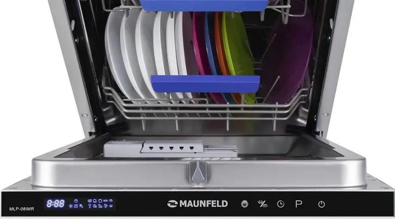Посудомоечная машина MAUNFELD MLP-08IMR с узким типом корпуса и полной встраиваемостью имеет загрузку до 10 комплектов посуды. Оборудована дисплеем и конденсационной системой сушки. Расход воды достигает 9 литров, уровень шума составляет 47 дБ. Предусмотрено 7 температурных режимов и 9 программ мойки, включая автоматическую, интенсивную, стандартную, экономичную ECO, для стекла, экспресс-программу и режим половинной загрузки. Время мойки при обычной программе составляет 186 минут. Оснащена тремя корзинами, включая регулируемую по высоте и отсек для столовых приборов. Имеет электронное управление, защиту от протечек AquaStop, таймер отсрочки запуска до 24 часов и индикацию наличия соли, ополаскивателя. Поддерживает использование средств 3 в 1. Классы эффективности: мойка A, энергопотребление A++, сушка A. Мощность потребления 2100 Вт при напряжении 220-240 В. Габариты (ШхВхГ) составляют 44.5x81.5x55 см, вес 32.7 кг. Размеры ниши для встраивания: ширина 45 см, минимальная высота 82 см, глубина 58 см.