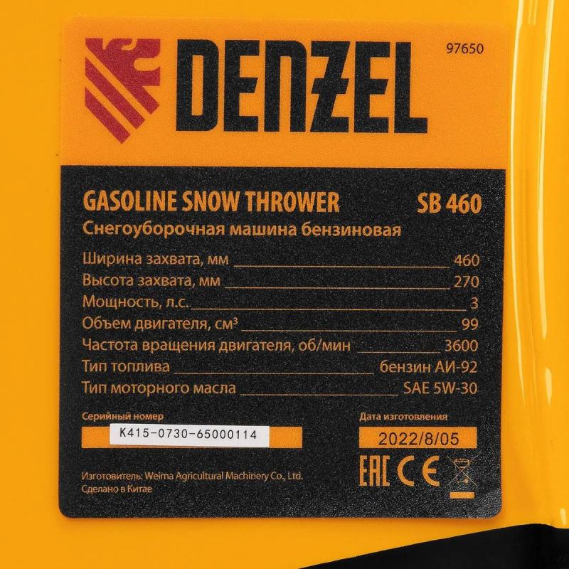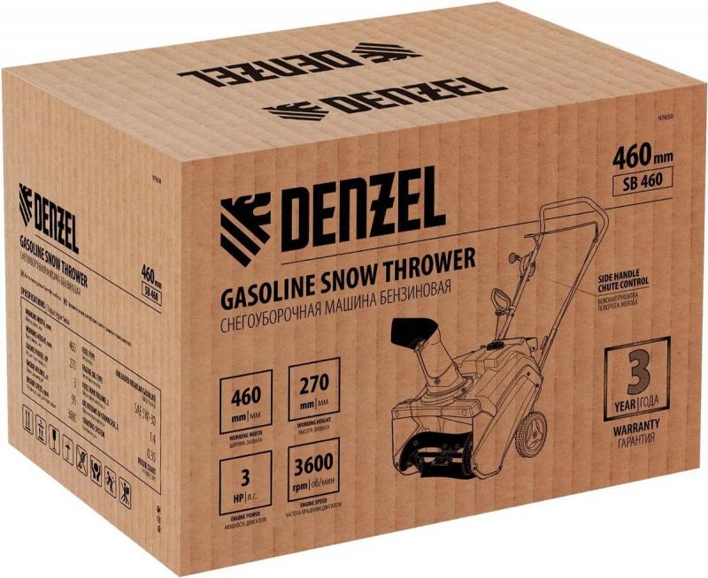 Снегоуборщик DENZEL SB 460 с бензиновым двигателем мощностью 3 л.с. и объемом 99 см³. Одноступенчатая система шнеков выполнена из армированной резины. Ширина ковша 46 см. Высота захвата 27 см. Дальность выброса снега составляет 10 м. Устройство не является самоходным. Запуск осуществляется вручную. Объем топливного бака 1.4 л. Колеса диаметром 7 дюймов. Размеры: 72.5х46х51. Вес: 30 кг.