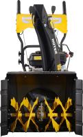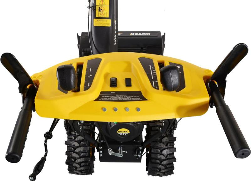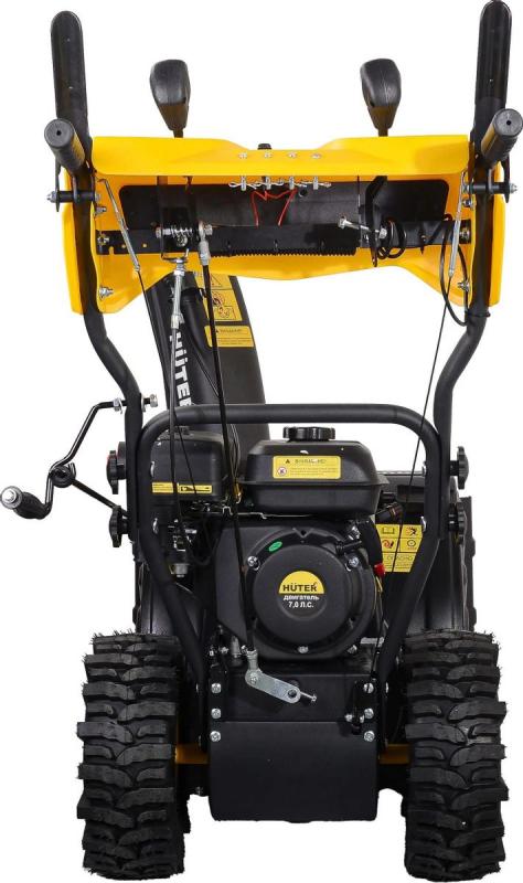 Снегоуборщик HUTER SGC 4100LX с бензиновым четырехтактным двигателем Huter объемом 212 см³ и мощностью 7 л.с. (5150 Вт). Двухступенчатая система шнеков выполнена из металла. Ширина ковша 68 см. Высота захвата 54 см. Дальность выброса снега до 15 м. Устройство самоходное с 6 скоростями вперед и 2 назад. Запуск — ручным стартером. Объем топливного бака 3.6 л. Регулировка положения желоба — рычагом, угол поворота 180 градусов. Оснащен фарой для работы в темное время суток. Подогрев ручек отсутствует. Колеса размером 35.5×12.7 см с агрессивным протектором обеспечивают высокую проходимость. Имеются ограничительные башмаки и полозья для защиты ковша. Вес: 73 кг.