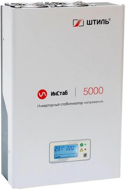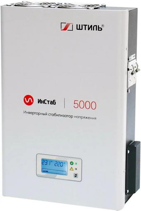 Инверторный стабилизатор напряжения Штиль ИнСтаб IS5000 с бестрансформаторной схемой двойного преобразования на IGBT-транзисторах и микропроцессорным управлением. Имеет входное напряжение 90-310 В, выдает чистую синусоиду 220 В с точностью 2%. Обеспечивает мгновенную реакцию на изменения входного напряжения, фильтрует высокочастотные помехи. Защищает от короткого замыкания, перегрузки, выхода за пределы входного напряжения и перегрева. Работает при температуре +5...+40°С, имеет светодиодную индикацию и ручной байпас. Мощность 4.5 кВт, максимальная 5 кВА. Габариты 246х358х101 мм.