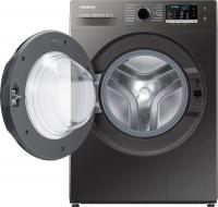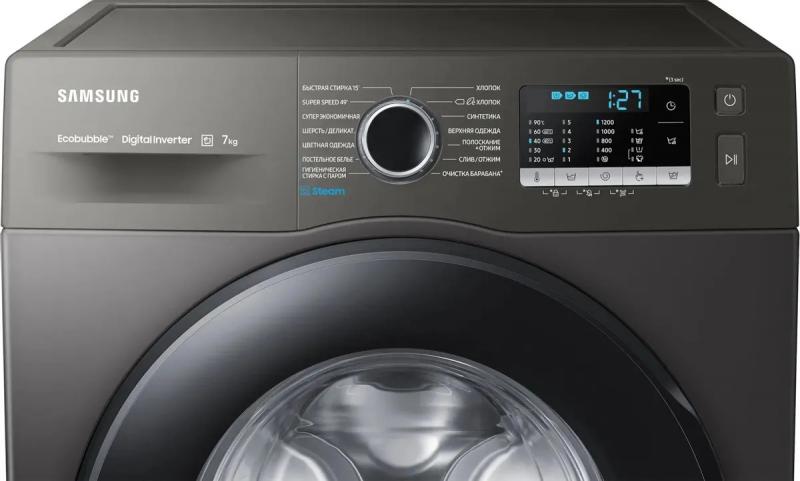 Стиральная машина Samsung WW70AGAS25AXLP с фронтальной загрузкой на 7 кг белья оснащена инверторным двигателем и электронным управлением с русскоязычной панелью. Скорость отжима достигает 1200 об/мин, уровень шума при стирке составляет 57 дБ, при отжиме - 75 дБ. Расход воды за цикл - 42 литра. Предусмотрены регулируемые ножки для установки. Безопасность обеспечивается блокировкой от случайного нажатия, защитой от детей и скачков напряжения, таймером отсрочки запуска до 24 часов. Включает 20 программ, в том числе паровую обработку, быструю стирку, режимы для хлопка, синтетики, шерсти. Температурный диапазон 20-90°C. Классы: стирки A, отжима B, энергопотребления A. Габариты (ШхВхГ): 60х85х45 см, глубина с выступающими элементами 52.5 см, вес 52 кг. Цвет корпуса серый, люк черный.