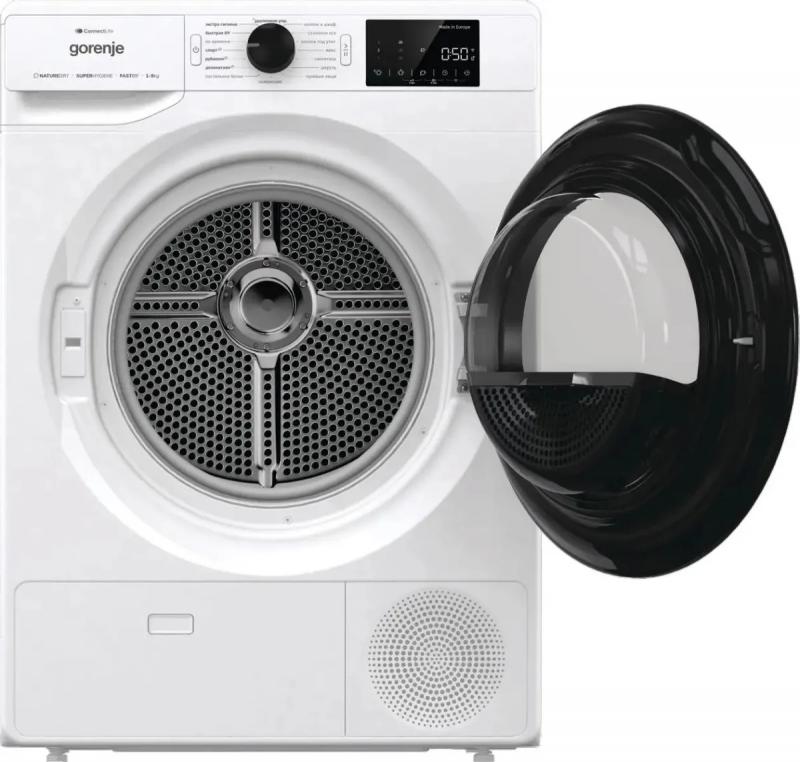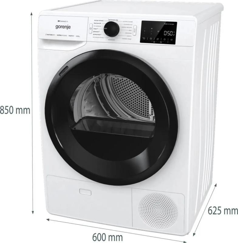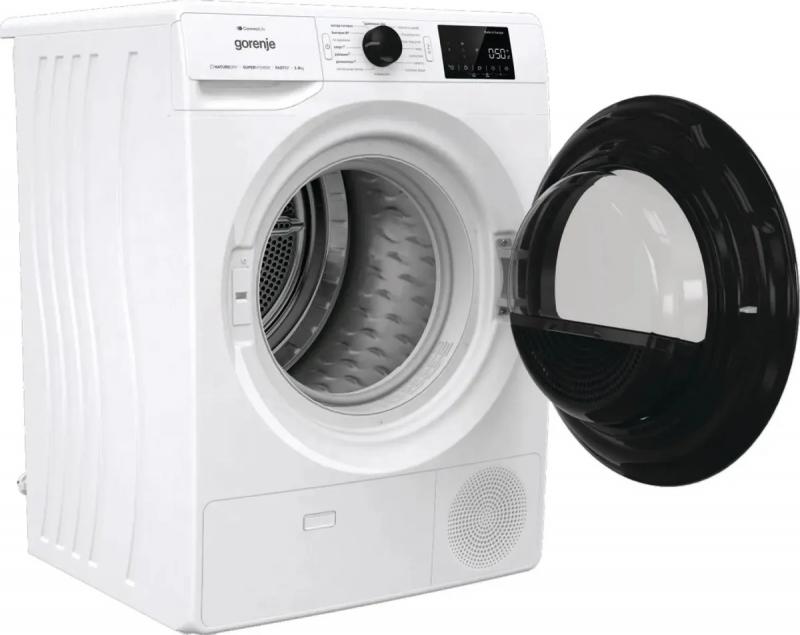 Сушильная машина GORENJE DPNE92GNLWIFI/C с системой сушки Heat Pump имеет загрузку 9 кг и класс энергопотребления A++. Барабан выполнен из нержавеющей стали, диаметр загрузочного люка составляет 35 см с углом открытия 180 градусов. Уровень шума при работе достигает 65 дБ. Модель оснащена электронным управлением, дисплеем и функцией отсрочки старта. Включает 16 программ сушки, индикацию влажности белья и подсветку барабана. Поддерживается управление через мобильное устройство. Цвет корпуса белый, люк черный. Размеры составляют 60х62.5х85 см, вес 45.4 кг. Габариты упаковки 0.69x0.64x0.86 м, вес брутто 54 кг.
