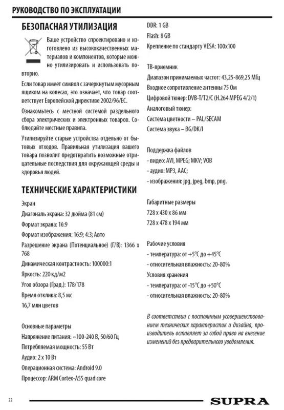 Телевизор SUPRA STV-LC32ST0045W с диагональю 32" и разрешением 1366x768 работает на операционной системе Android 9.0. LED-панель с Direct LED подсветкой имеет частоту обновления 50 Гц, яркость 220 кд/м2 и контрастность 100000:1. Время отклика пикселя составляет 8.5 мс, углы обзора 178° по вертикали и горизонтали. Модель оснащена процессором ARM Cortex-A55x4, имеет 1 ГБ оперативной и 8 ГБ встроенной памяти. Телевизор поддерживает цифровые тюнеры DVB-T, DVB-T2, DVB-C, оснащен стереозвуком и функциями EPG, телетекста, игрового режима. Имеются 3 разъема HDMI 1.4a, 2 USB, CI+/PCMCIA, RJ-45, антенный вход IEC75 и разъем для наушников. Поддерживает воспроизведение множества форматов видео, аудио и изображений. Корпус черного матового цвета с боковой подставкой совместим с креплением VESA 100x100. Размеры без подставки 728x430x86 мм, вес 4.5 кг.