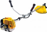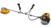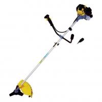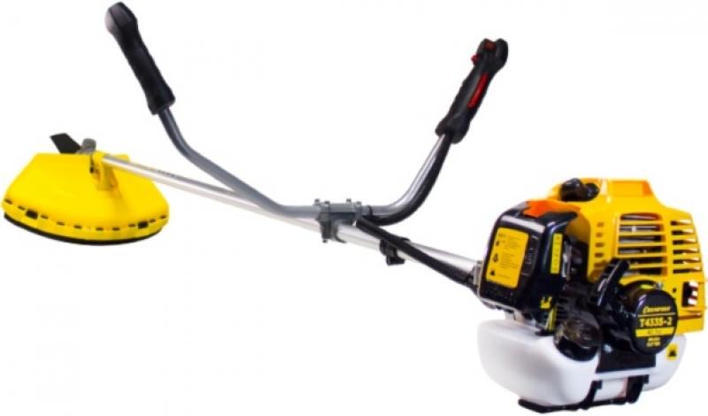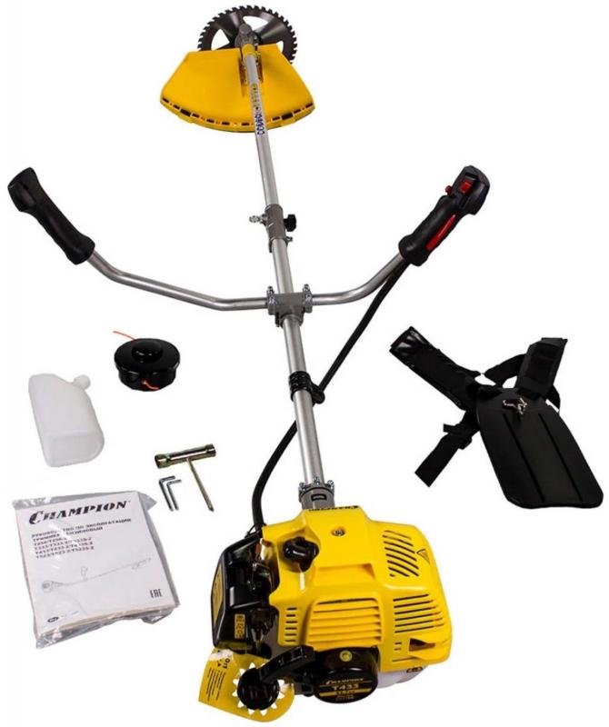 Бензиновый триммер Champion T433-2 с двухтактным двигателем мощностью 1250 Вт (1.7 л.с.), объемом 42.7 куб. см и частотой вращения 6500 об/мин. Емкость топливного бака 0.95 л. Режущие элементы: трехлопастной нож диаметром 255 мм и леска толщиной 3 мм. Диаметр круга стрижки 40 см. Двигатель расположен сверху, штанга разборная, прямая, с U-образной рукояткой. В комплект входят плечевой ремень, защитная скоба и кожух для защиты от травы. Особенности: воздушное охлаждение, праймер, удобство хранения за счет разборной штанги. Подходит для скашивания травы и ухода за участком. Вес: 8.2 кг.