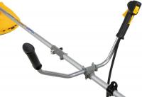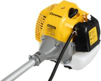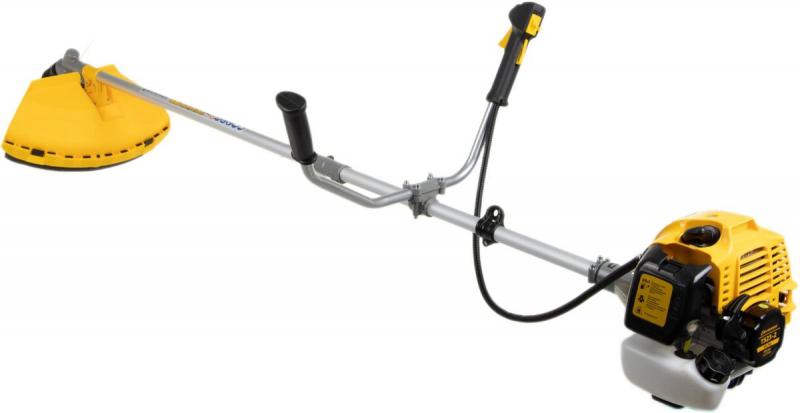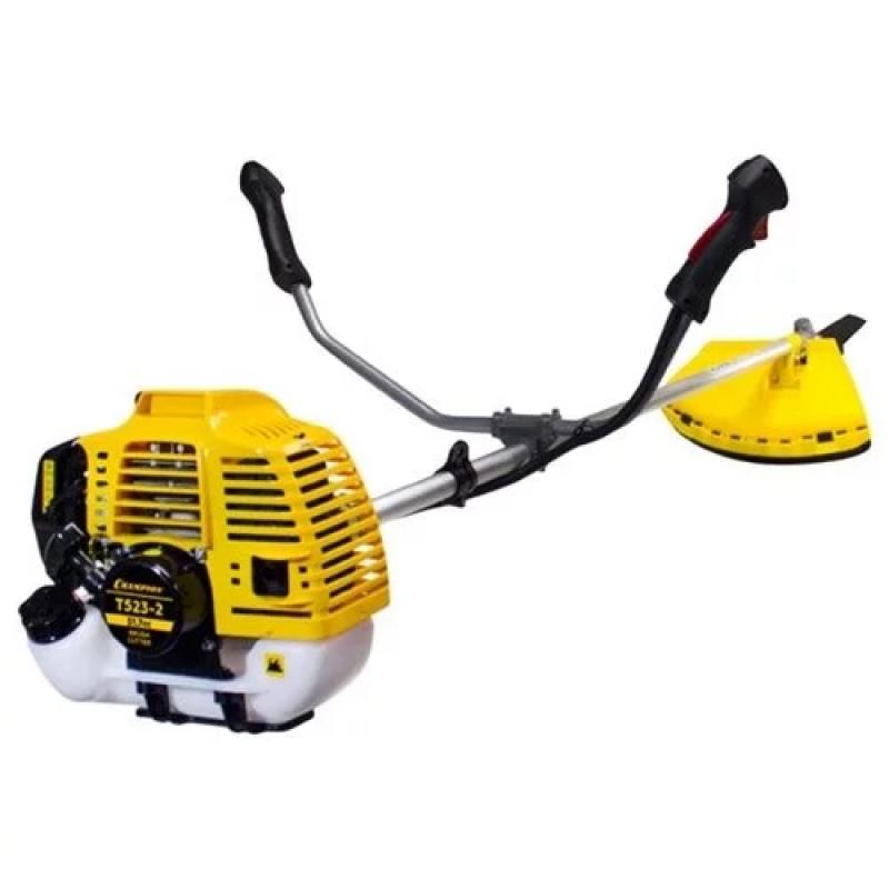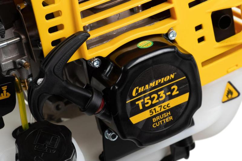 Бензиновый триммер Champion T523-2 с двухтактным двигателем мощностью 1400 Вт (1.9 л.с.), объемом 51.7 куб. см и частотой вращения 6500 об/мин. Емкость топливного бака 0.95 л. Режущие элементы: нож диаметром 255 мм и леска толщиной 2.4 мм. Диаметр круга стрижки 40 см. Двигатель расположен сверху, штанга разборная, прямая, с U-образной рукояткой. В комплект входят плечевой ремень, защитная скоба, нож и леска. Особенности: возможность изменения диаметра лески от 1.6 до 3 мм, воздушное охлаждение двигателя. Подходит для скашивания травы и ухода за участком. Вес: 8.3 кг.