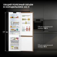 Холодильник HYUNDAI HBR 1785 полновстраиваемый с перевешиваемыми дверями и нижним расположением морозильной камеры. Общий объем 243 литра, из них 180 литров приходится на холодильную камеру с капельной системой размораживания Frost Free и тремя стеклянными полками, а также 63 литра на морозильную камеру с системой No Frost. Имеет сенсорное управление, внутренний дисплей и функции суперзаморозки и суперохлаждения. Климатический класс N и T. Температурный режим холодильной камеры от 2 до 8 градусов, морозильной - от -16 до -24 градусов. Включает три ящика в холодильной и три ящика в морозильной камере. Мощность замораживания составляет 3 кг/сутки. Класс энергопотребления A+ с годовым расходом 287 кВт*ч и возможностью автономного сохранения холода до 12 часов. Размеры (ШхВхГ) 54x177x54.5 см, вес 49 кг.