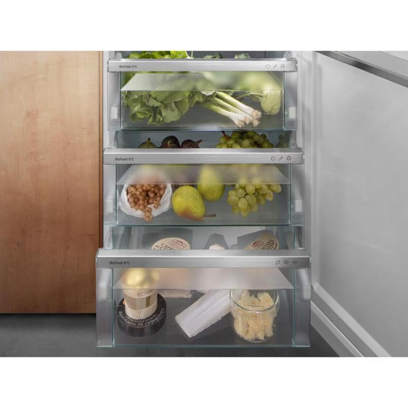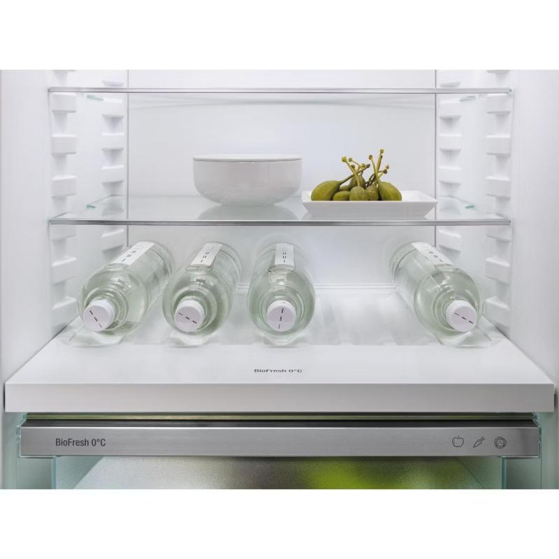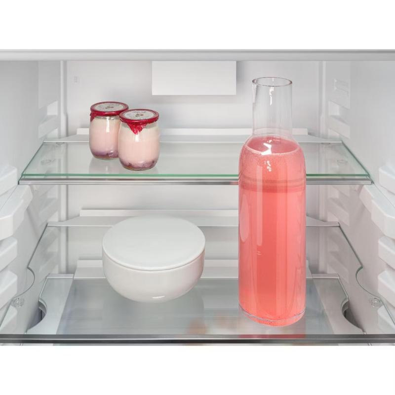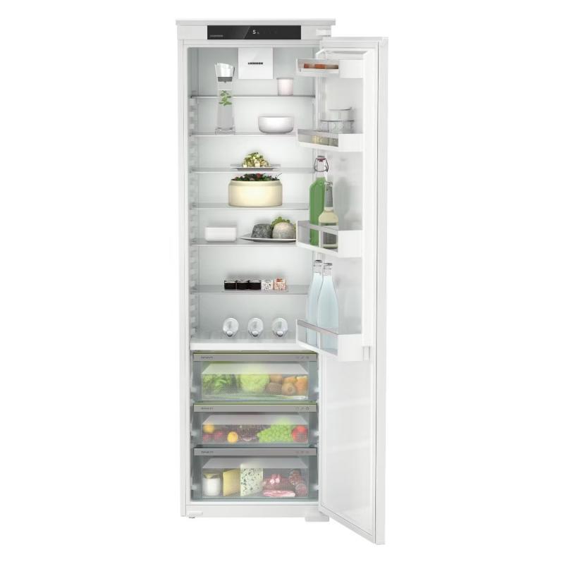 Встраиваемый холодильник Liebherr IRBSd 5120 имеет общий объем 291 литр и оснащен инверторным компрессором с хладагентом R600a. Управление осуществляется с помощью электронной сенсорной панели, присутствует LED-освещение и цифровой дисплей. Модель поддерживает режимы работы отпуск и суперохлаждения, оснащена системой капельного размораживания. Внутри семь полок из закаленного стекла, одна из которых складная, четыре полки на двери и три ящика в зоне сохранения свежести. Имеется кронштейн для бутылок и подставка для яиц. Предусмотрены системы безопасности: защита от детей, звуковая и световая сигнализация открытой двери и повышения температуры. Климатический класс SN-T, уровень шума 35 дБ. Габаритные размеры 177х54х54.5 см, вес 56.9 кг.