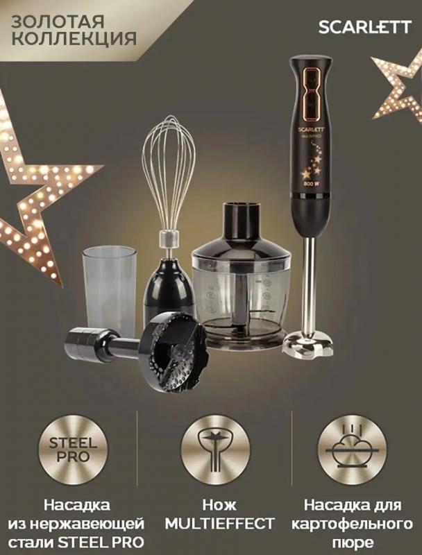 Погружной, мощность 800 Вт, погружная часть металл, корпус пластик, крепление на стену, измельчитель, мерный стакан, венчик для взбивания.