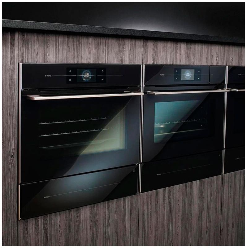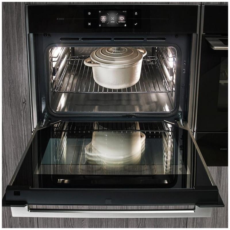 Электрический духовой шкаф Asko Elements OCS8678G из серии Elements обладает объемом 75 л, классом энергоэффективности A+ и потребляемой мощностью 3400 Вт. Оснащен сенсорным управлением, цветным дисплеем, системой охлаждения и пиролитической очисткой. Включает 160 автоматических программ, 22 режима работы, термощуп, гриль, таймер и отсроченный старт. Дверца откидная с 4 стеклами, максимальная температура нагрева 230 °C. Внутреннее покрытие выполнено из эмали, цвет антрацит. Телескопические направляющие установлены на трех уровнях. Размеры: 595 х 595 х 546 мм, вес 51.100 кг.