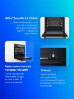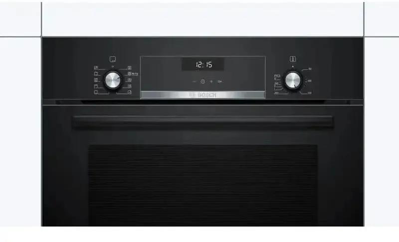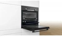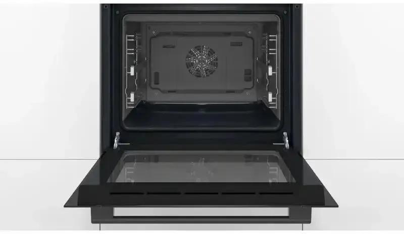 Электрический духовой шкаф BOSCH HBJ558YB3Q оснащен поворотными и сенсорными переключателями. Мощность подключения составляет 3300 Вт, класс энергоэффективности A. Объем камеры 66 литров, максимальная температура нагрева 275 °С. Внутреннее покрытие выполнено из эмали легкой очистки. Имеется конвекция и электрический гриль. Дисплей, часы и электронный таймер встроены. Предусмотрено 8 программ работы. Телескопические направляющие двухуровневого типа обеспечивают удобство использования. Дверца открывается вниз, состоит из двух стекол, внутренняя поверхность полностью стеклянная. Максимальная температура поверхности дверцы 40 °С. Подсветка реализована одной галогенной лампой. Имеется защитное отключение и блокировка от детей. Цвет черный. Габариты (ШхГхВ) 59.4 х 56.7 х 59.5 см, размеры ниши для встраивания (ШхГхВ) 56 x 55 x 57.5 см. Вес 35.5 кг.