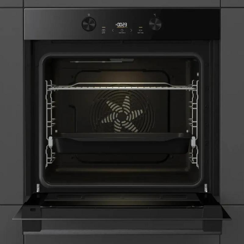 Электрическая духовка GORENJE BOS6737E05DBG с независимым управлением оснащена поворотными и сенсорными утапливаемыми переключателями. Мощность подключения составляет 3500 Вт, класс энергоэффективности A+. Объем камеры 77 литров, максимальная температура нагрева 300 °С. Внутреннее покрытие выполнено из пиролитической эмали, предусмотрена очистка паром. Имеется конвекция и электрический гриль. Дисплей, часы и электронный таймер встроены. Многофункциональная духовка предлагает 9 программ приготовления. В комплекте телескопические направляющие одноуровневого типа. Дверца открывается вниз, полностью стеклянная внутренняя поверхность состоит из двух стекол. Присутствует подсветка с одной лампой, защитное отключение и блокировка от детей. Длина кабеля 1.32 м. Размеры изделия 59.5х56.4х59.5 см, размеры ниши для встраивания 56x55x59 см. Вес 28.2 кг.