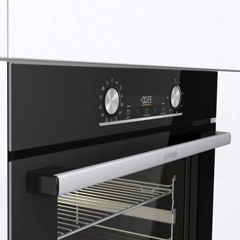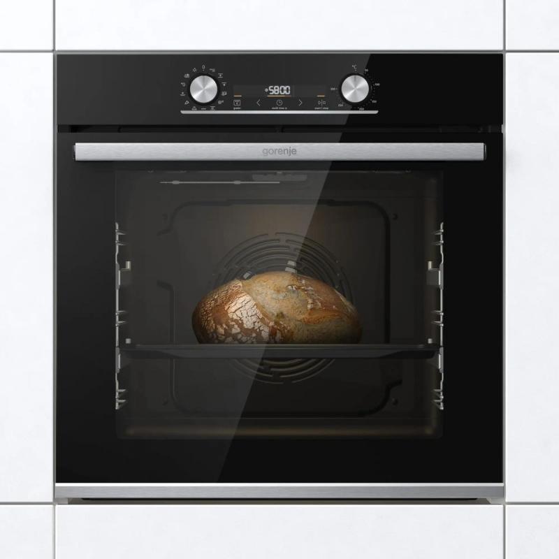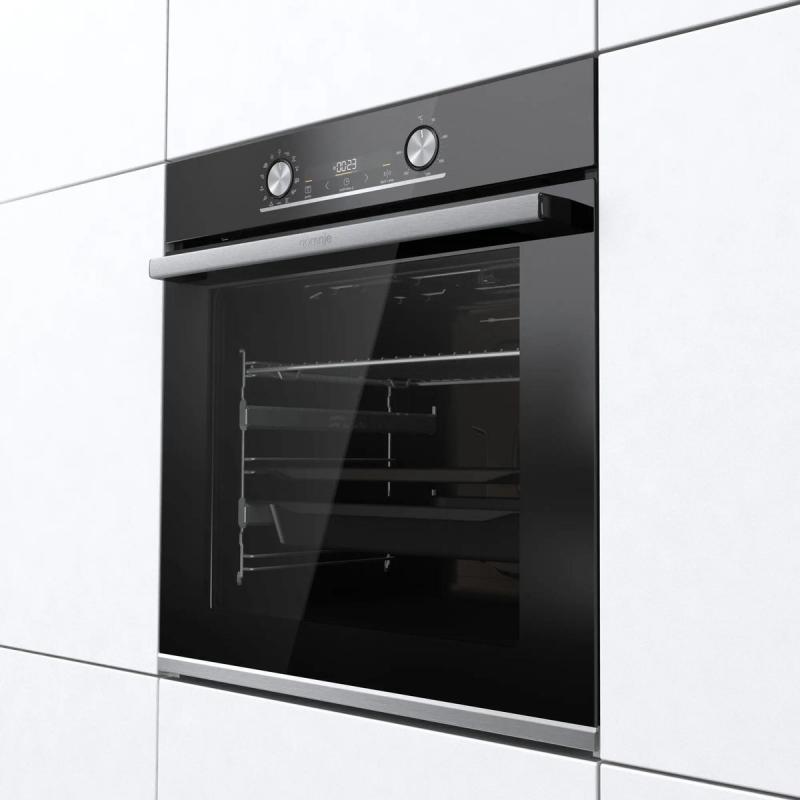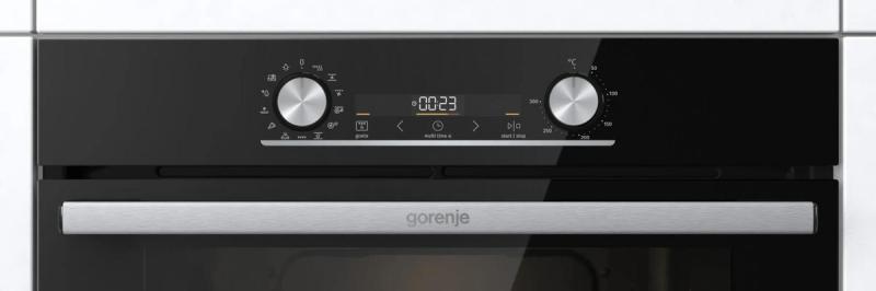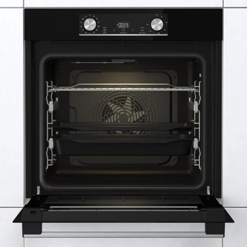 Электрическая духовка GORENJE BOSX6737E09BG с независимым управлением оснащена сенсорными переключателями с утапливаемыми элементами. Мощность подключения составляет 3500 Вт, класс энергоэффективности A. Объем камеры 77 л с максимальной температурой нагрева 300 °С. Внутреннее покрытие выполнено из пиролитической эмали, доступна очистка паром AquaClean. Имеется конвекция и электрический гриль мощностью 2300 Вт. Дисплей, часы и электронный таймер встроены. Программатор позволяет выбрать одну из 13 программ приготовления. Предусмотрены различные режимы: быстрый нагрев, классический нагрев с вентилятором, гриль с вентилятором, AirFry, работа с функцией пара, медленное приготовление GentleBake, пицца, FrozenBake, размораживание, AquaClean, освещение. Автоматический быстрый разогрев и функция подогрева посуды включены. Возможность приготовления на пару реализована. Телескопические направляющие двухуровневого типа установлены. Дверца открывается вниз, содержит два стекла. Защитное отключение присутствует. Цвет черный. Размеры (ШхГхВ): 59.5 х 56.4 х 59.5 см, размеры ниши для встраивания (ШхГхВ): 56.4 x 55 x 60 см, вес 28.1 кг.