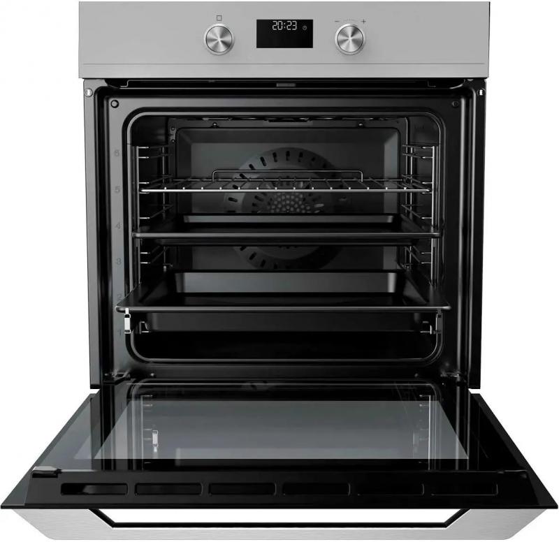 Электрическая духовка HAIER HOQ-K5AAN3GG с независимым управлением оснащена поворотными и сенсорными утапливаемыми переключателями. Мощность подключения составляет 3480 Вт, класс энергоэффективности A+. Объем камеры 72 литра, максимальная температура нагрева 250 °C. Внутреннее покрытие выполнено из эмали легкой очистки, предусмотрена система аква очистки. Имеется конвекция, электрический гриль, дисплей, часы, электронный таймер и программатор. Духовка многофункциональная, содержит 16 программ, функцию автоматического быстрого разогрева и вентилятор охлаждения. Телескопические направляющие одноуровневые, дверца открывается вниз. Внутренняя поверхность дверцы полностью стеклянная, состоит из трех стекол. Освещение галогеновое, одна лампа подсветки. Длина кабеля 1 метр. Размеры прибора 59.5 х 56.5 х 59.5 см, размеры ниши для встраивания 56 x 58 x 60 см. Вес 38 кг. Цвет серый/серебристый.