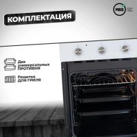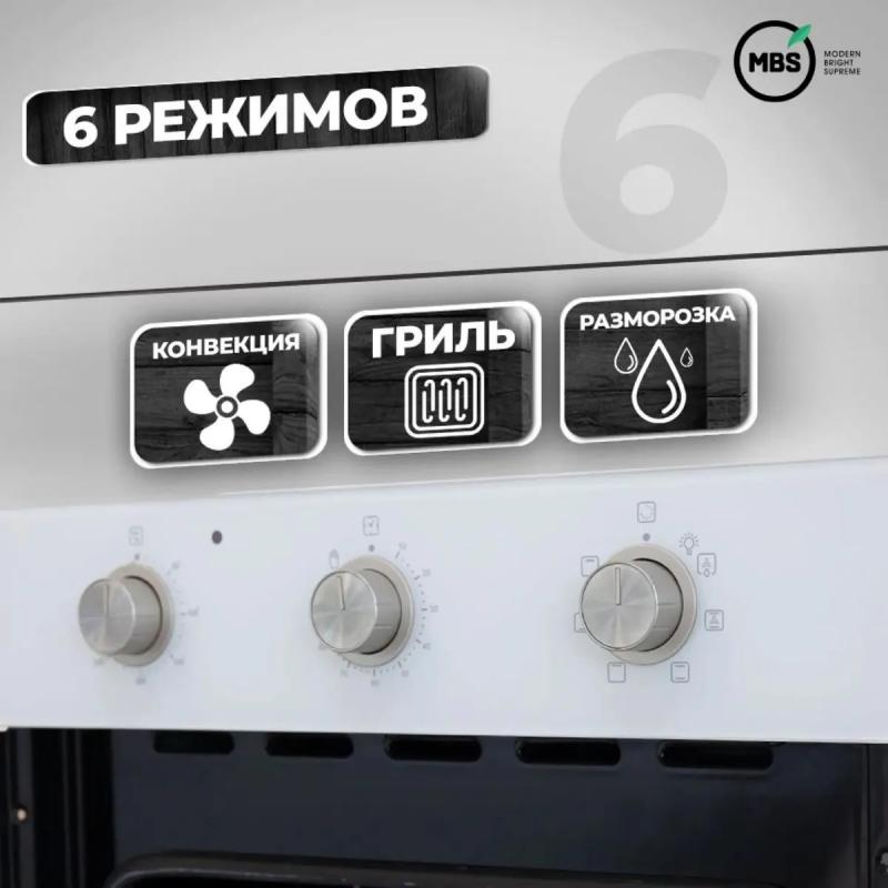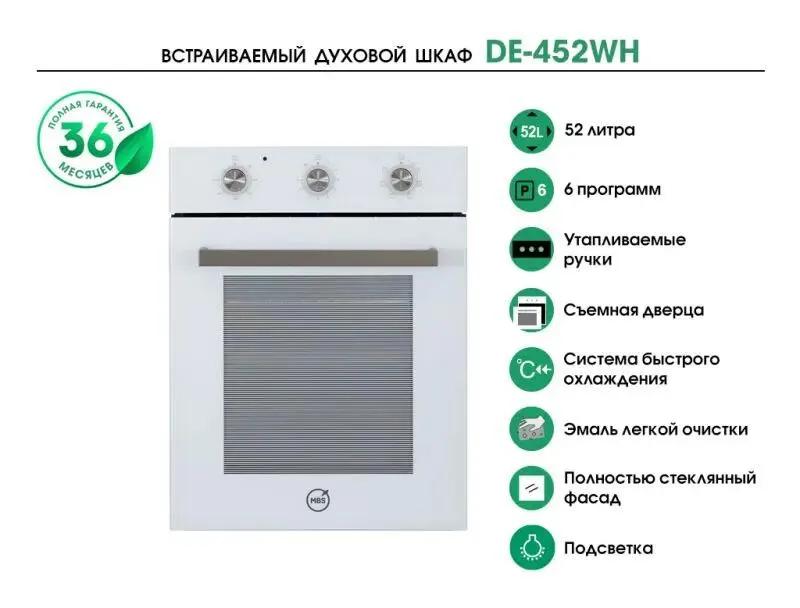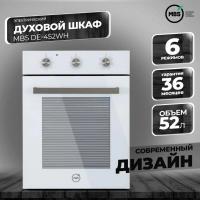 Электрическая духовка MBS DE-452 имеет независимое управление с утапливаемыми поворотными переключателями. Мощность подключения составляет 3500 Вт, класс энергоэффективности A. Объем камеры 52 литра, максимальная температура нагрева 240 °С. Внутреннее покрытие выполнено из эмали легкой очистки, предусмотрена гидролизная система очистки. Имеется конвекция и электрический гриль. Таймер электромеханического типа. Предусмотрено 6 программ приготовления. Вентилятор охлаждения в комплекте. Дверца открывается вниз, оснащена полностью стеклянной внутренней поверхностью и двойным стеклопакетом. Подсветка представлена одной лампой накаливания мощностью 25 Вт. Подключение осуществляется через кабель с вилкой длиной 1 метр. Цвет корпуса белый с элементами из стекла. Размеры изделия 45 х 56 х 59.6 см, размеры ниши для встраивания 41.5 x 56 x 60 см. Вес 22 кг.
