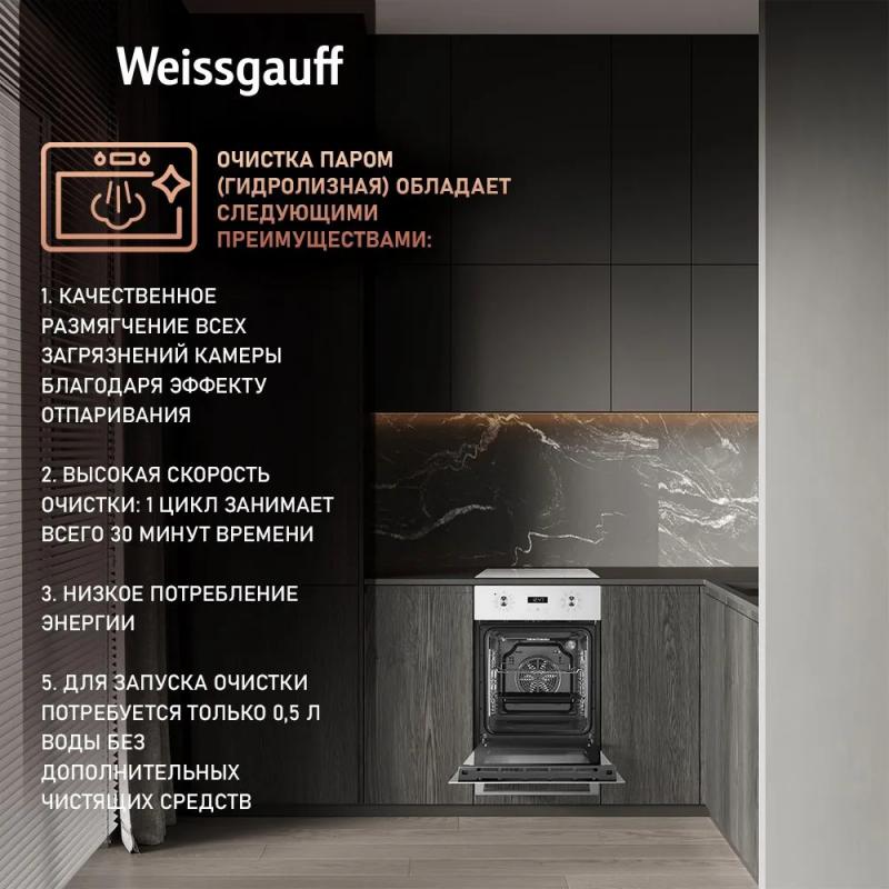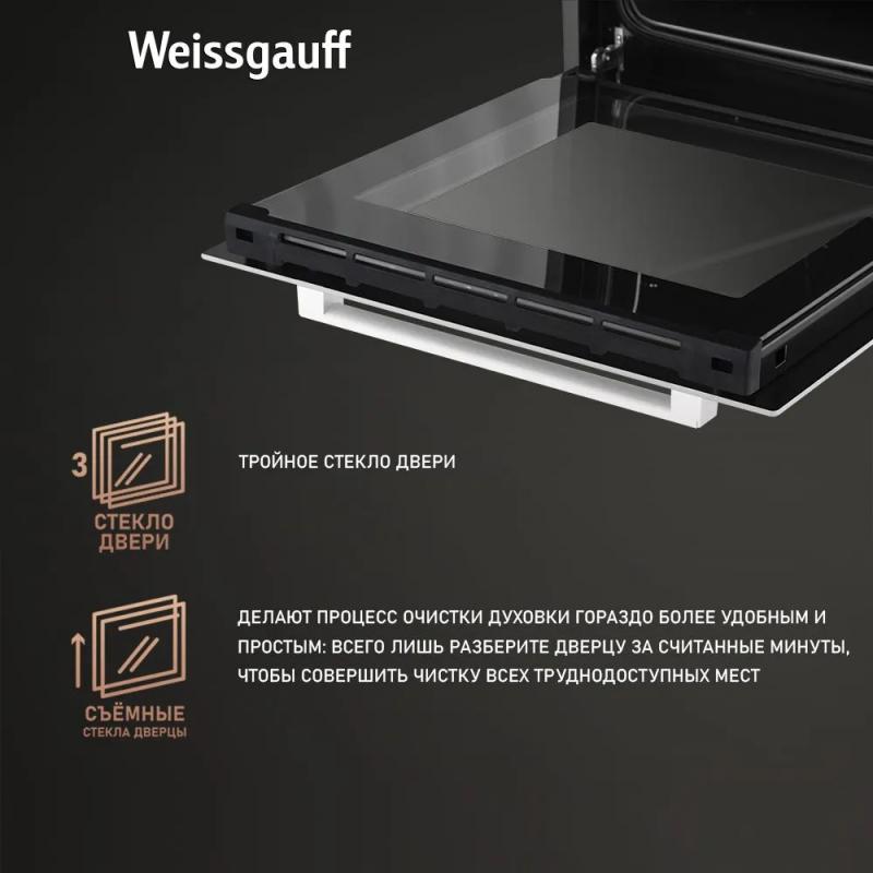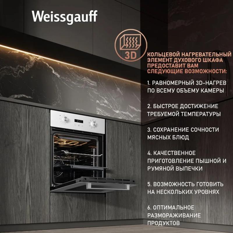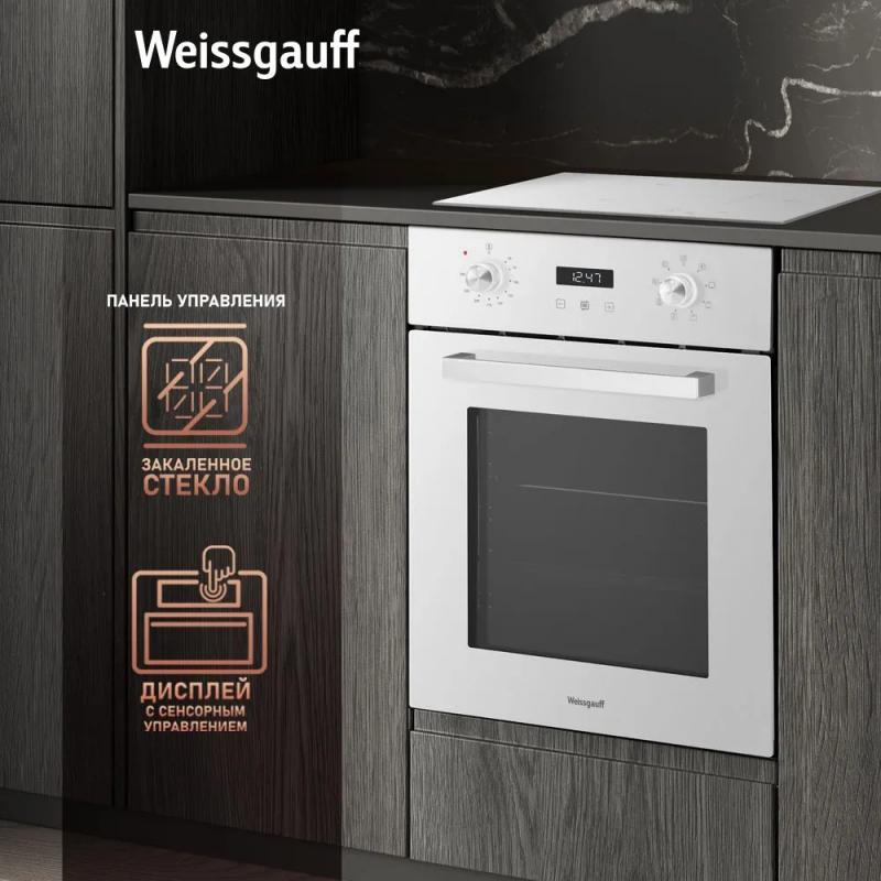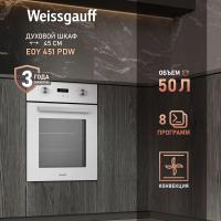 Электрическая духовка WEISSGAUFF EOY 451 PDW с независимым управлением оснащена поворотными и сенсорными утапливаемыми переключателями. Мощность подключения составляет 2800 Вт, класс энергоэффективности A+. Объем камеры 50 л, максимальная температура нагрева 250 °С. Внутреннее покрытие выполнено из эмали легкой очистки. Имеется конвекция и электрический гриль. Дисплей, часы и электронный таймер встроены. Предусмотрено 8 программ приготовления: верхний и нижний нагрев, размораживание, нижний нагрев, двойной гриль, гриль с конвекцией, верхний и нижний нагрев с конвекцией, турбоконвекция, предварительный нагрев. Дверца открывается вниз, состоит из трех стекол. Подсветка представлена одной лампой накаливания мощностью 25 Вт. Длина кабеля 1.2 м. Размеры изделия 45 х 56.5 х 59.5 см, размеры ниши для встраивания 430 x 55 x 59.5 см. Вес 24.5 кг. Цвет белый.