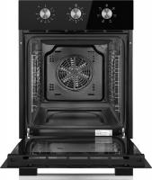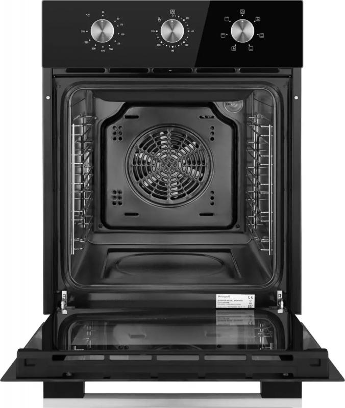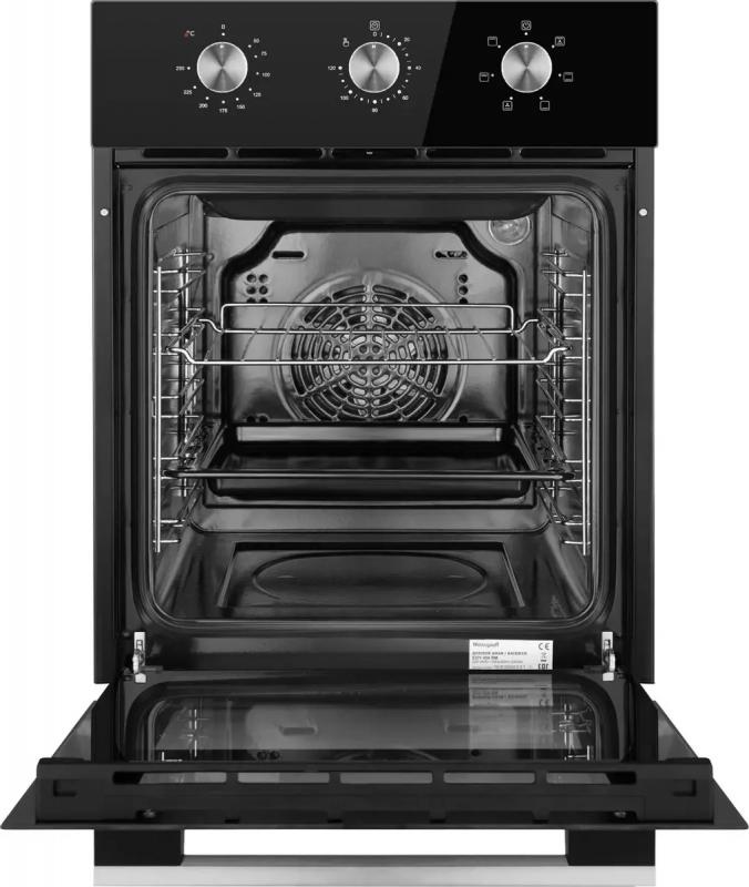 Духовой шкаф WEISSGAUFF EOY 456 BM электрический имеет механическое управление с поворотными переключателями. Мощность подключения составляет 2200 Вт. Объем 50 литров, максимальная температура нагрева 250 °С. Внутреннее покрытие выполнено из эмали легкой очистки, предусмотрена очистка паром. Оснащен электрическим грилем и функцией конвекции. Включает таймер и 6 программ работы. Дверца открывается вниз, состоит из трех стекол. Подсветка обеспечивается одной лампой, внутренняя поверхность дверцы полностью стеклянная. Цвет черный. Класс энергоэффективности A. Размеры (ШхГхВ) 45 х 56.5 х 59.5 см, вес 24.2 кг.