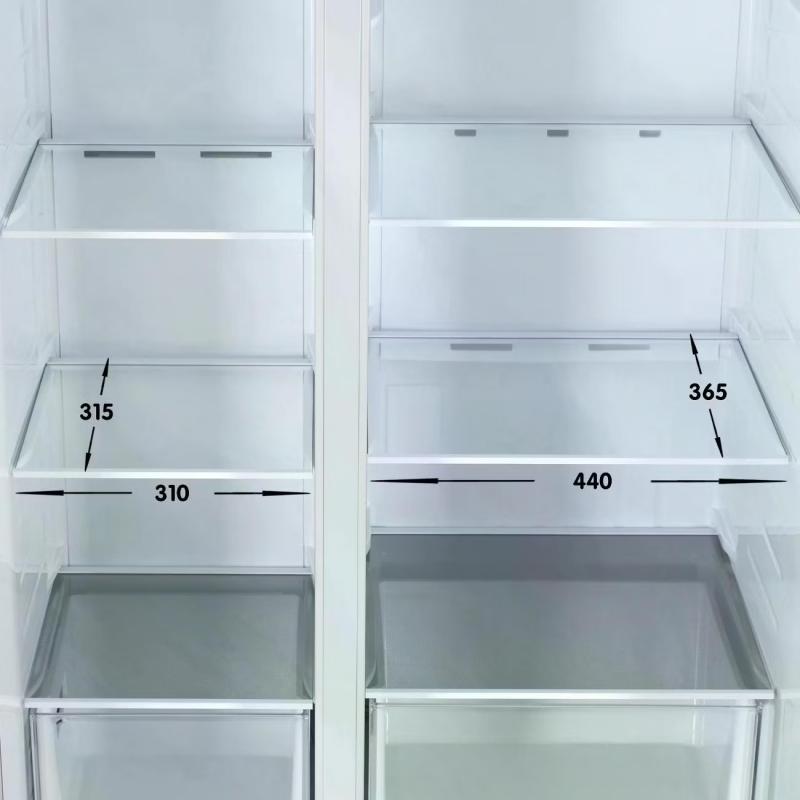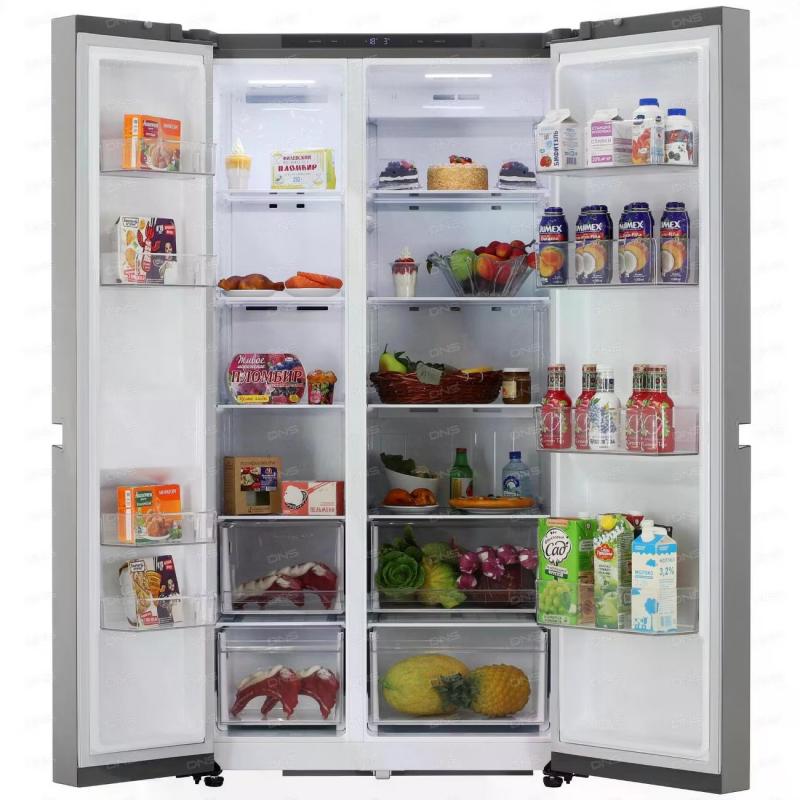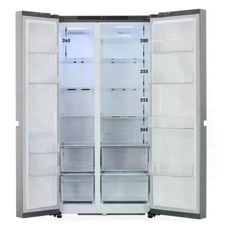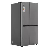 Холодильник LG GC-B257KMHW имеет две камеры с общим объемом 703 литра и полезным объемом 422/206 литров. Оснащен инверторным компрессором и системой No Frost в обоих отсеках. Холодильное отделение содержит 4 полки, 4 ящика для овощей и 4 полки на двери, есть подставка для яиц и светодиодная подсветка. Морозильная камера расположена сбоку, вмещает 6 ящиков и имеет мощность замораживания 12 кг/сутки. Управление механическое, предусмотрен режим энергосбережения. Годовое потребление электроэнергии составляет 420 кВтч, класс энергоэффективности A+. Прибор оснащен антибактериальным покрытием, может работать при отключении электричества до 3 часов. Двери металлические с возможностью открывания в обе стороны, ручки скрытого типа. Уровень шума не превышает 36 дБ. Габариты холодильника без упаковки 179х91.3х73.5 см, вес 101 кг.