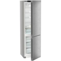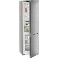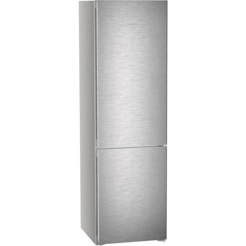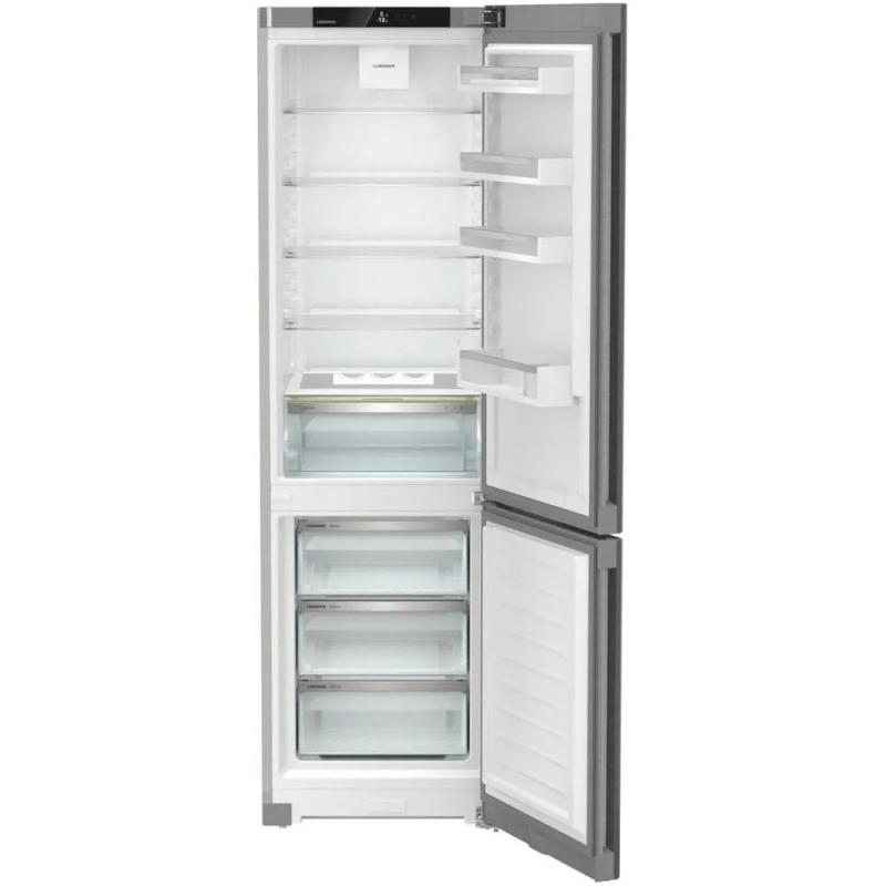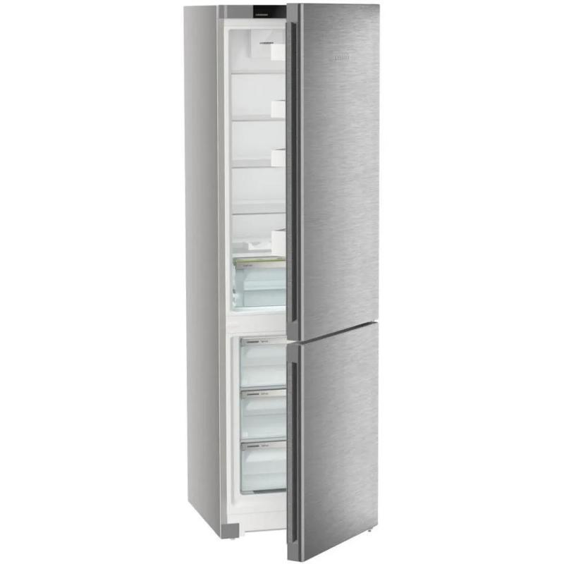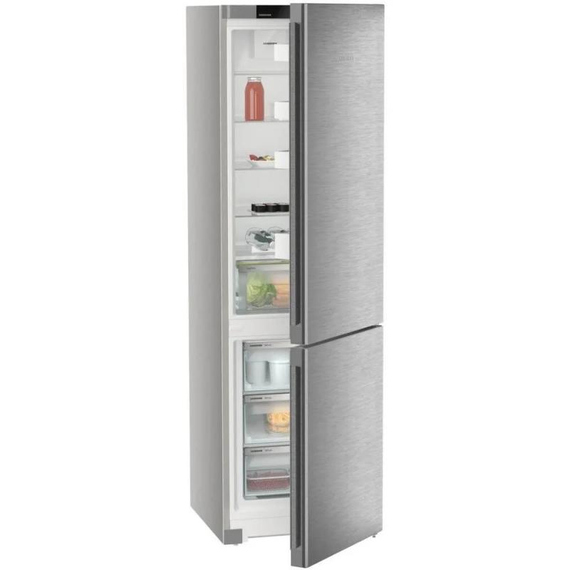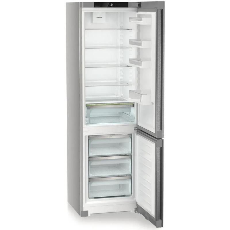 Холодильник LIEBHERR CNsdc 5703 двухкамерный с нижним расположением морозильной камеры. Общий объем 383 литра, полезный объем 360 литров. Холодильное отделение содержит 277 литров общего и 266 литров полезного пространства, система размораживания капельная. Морозильная камера объемом 106 литров оснащена системой No Frost и способна замораживать до 16 кг продуктов в сутки. Управление сенсорное, дисплей внутренний. Климатический класс N/SN/ST/T. Предусмотрены функции суперзаморозки SuperFrost, суперохлаждения, защита от детей и режим отпуск. Индикация температуры, работы и открытой двери со звуковым сигналом. В комплекте 5 стеклянных полок и 4 полки на дверце. Двери перевешиваемые, ножки регулируются по высоте. Хладагент R600a, один компрессор. Класс энергопотребления A++, годовое потребление 233 кВт*ч. Автономное сохранение холода при отключении питания 24 часа. Цвет серебристый. Размеры (ШхВхГ) 59.7 х 201.5 х 67.5 см, вес 75.7 кг.