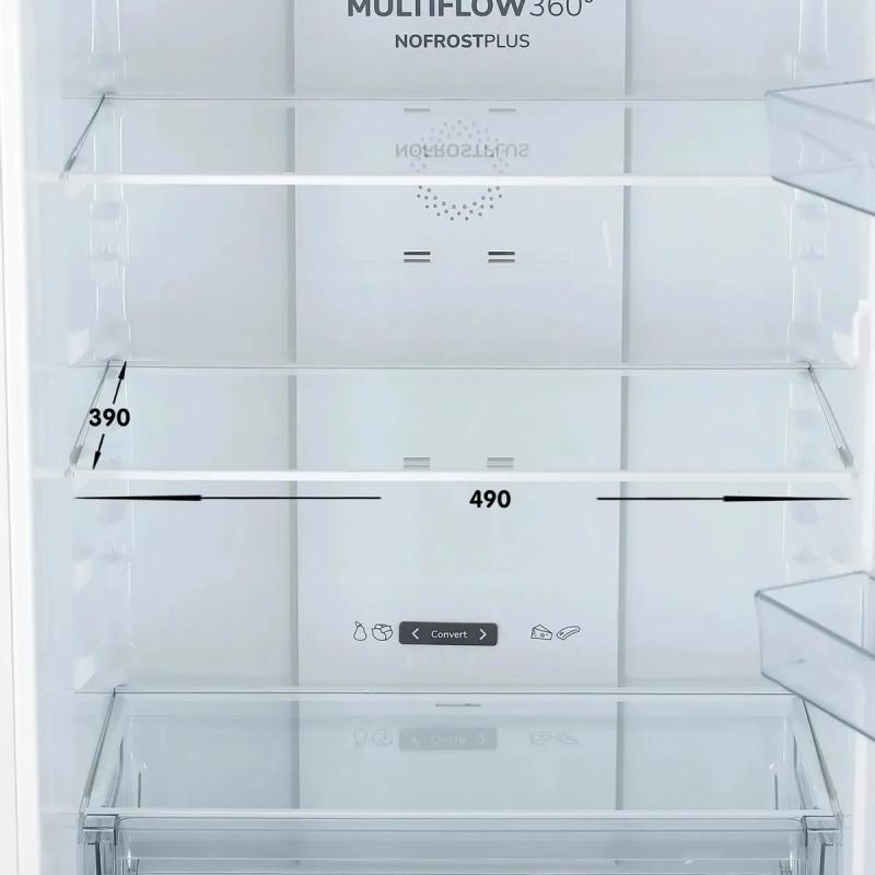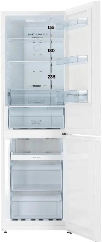 Холодильник двухкамерный GORENJE NRKP61EA2W4 — с нижней морозильной камерой, объемом 320 л (холодильная — 210 л, морозильная — 110 л). Обе камеры оснащены системой No Frost Plus, обеспечивающей автоматическое размораживание. Управление электронное, с внешним дисплеем и индикацией температуры и незакрытой двери. В холодильной камере — 3 стеклянные полки, 2 ящика и зона свежести FreshZone, на дверце — 3 полки. В морозильной камере — 1 полка и 2 ящика. Мощность замораживания — 12 кг/сут, режим FastFreeze. Класс энергопотребления A++, потребление — 240 кВт·ч/год, хранение при отключении — 17 ч. Один компрессор, перевешиваемые двери, регулируемые ножки. Уровень шума — 38 дБ. Подсветка LED. Цвет — белый. Габариты: 59,5 × 185 × 59,2 см. Вес нетто — 59 кг.