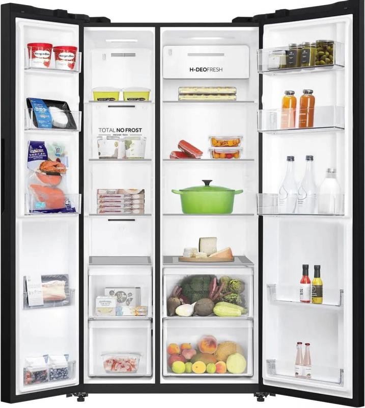 Холодильник HAIER HRF-600DB7RU с системой Full No Frost и инверторным компрессором работает на хладагенте R600a. Двухкамерный прибор имеет электронное управление и внешний дисплей. Общий объем 598 л распределен между холодильной камерой на 388 л и морозильной на 210 л расположенной сбоку. Температурный режим холодильного отделения от 1 до 9 °C поддерживается системой Multi Air Flow. Морозильная камера замораживает до 12 кг/сутки при температуре от -24 до -14 °C. В конструкции предусмотрены 4 стеклянные полки в холодильнике и 5 в морозильнике а также по 2 ящика в каждой камере. Антибактериальный фильтр повышает качество хранения продуктов. Прибор класса энергопотребления A++ потребляет 336 кВт*ч/год и работает с уровнем шума 38 дБ. Среди функций есть суперзаморозка суперохлаждение и звуковая индикация незакрытой двери. Металлические двери с 5 полками имеют черный цвет. Габариты составляют 90.5х177.5х71.7 см при весе 95 кг.