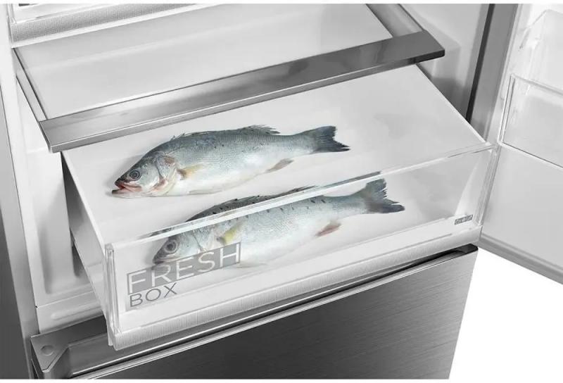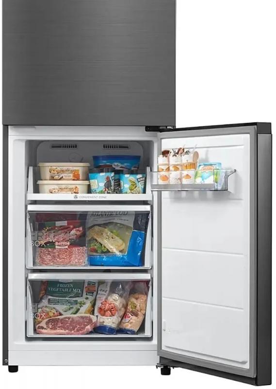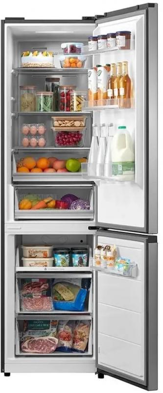 Холодильник MIDEA MDRB521MIE46ODM с электронным управлением и внешним дисплеем имеет двухкамерную конструкцию с нижним расположением морозильной камеры. Общий объем 402 л, полезный 360 л. Холодильная камера оснащена системой Full No Frost, тремя стеклянными полками, двумя ящиками и зоной свежести с регулировкой температуры. Температурный диапазон от 2°C до 8°C. Морозильная камера с Full No Frost имеет один отсек, два ящика, мощность замораживания 14 кг/сутки, температуру от -24°C до -16°C. Класс энергопотребления A++, годовое потребление 260 кВт*ч. Инверторный компрессор работает на хладагенте R600a. Функции: защита от детей, режим отпуск, суперзаморозка, суперохлаждение, управление со смартфона. Есть антибактериальное покрытие, LED подсветка, звуковая индикация открытой двери. Двери металлические с правым открыванием, три полки на дверце. Автономное сохранение холода 15 часов. Корпус выполнен из нержавеющей стали. Размеры (ШхВхГ): 59.5 х 201.8 х 66 см, вес 68 кг.