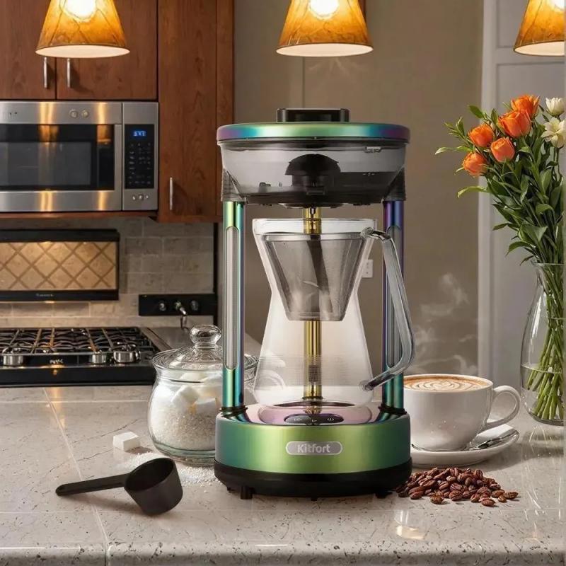 Капельная кофеварка KITFORT КТ-7488 работает с молотым кофе. Мощность устройства составляет 600 Вт. Объем резервуара для воды равен 0.6 литра, аналогичный объем имеет резервуар для готового кофе. Тип управления механический. Имеется индикатор уровня воды и противокапельная система. Корпус изготовлен из пластика зеленого цвета. Длина сетевого кабеля составляет 0.6 метра. Размеры кофеварки 20 х 34.5 х 20 см, вес 2.1 кг.