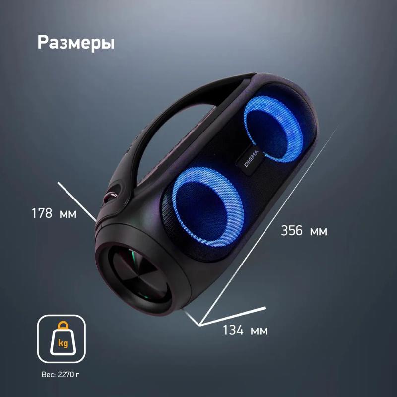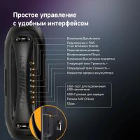 Колонка DIGMA D-PS1530 работает через Bluetooth 5.1 с поддержкой A2DP и имеет радиус действия до 10 метров. Звуковая система 2.1 обеспечивает суммарную мощность 50 Вт при частотном диапазоне 200 Гц - 20 кГц и отношении сигнал/шум 65 дБ. Встроенный FM-радиоприемник работает в диапазоне 87.5-108 МГц. Комплектация включает два 3-дюймовых СЧ динамика, один 2-дюймовый НЧ динамик и AUX кабель с USB кабелем. Устройство оснащено USB 2.0, AUX входом и регуляторами на верхней панели. Поддерживает кодеки MP3, WMA, WAV, Flac, AMR. Защищена по стандарту IPX5 и имеет светомузыку. Питается от сети или встроенного аккумулятора Li-Ion емкостью 3000 mAh, обеспечивающего до 15 часов работы после 3 часов зарядки. Возможна связь двух колонок одновременно. Корпус из пластика и ткани черного цвета. Размеры 356 x 178 x 134 мм, вес 2.27 грамма.