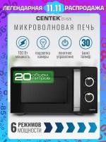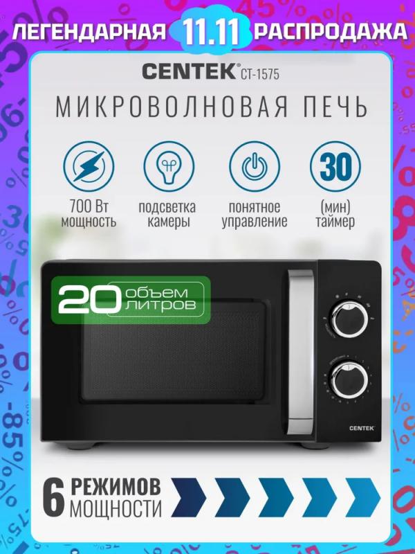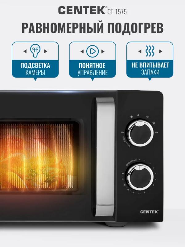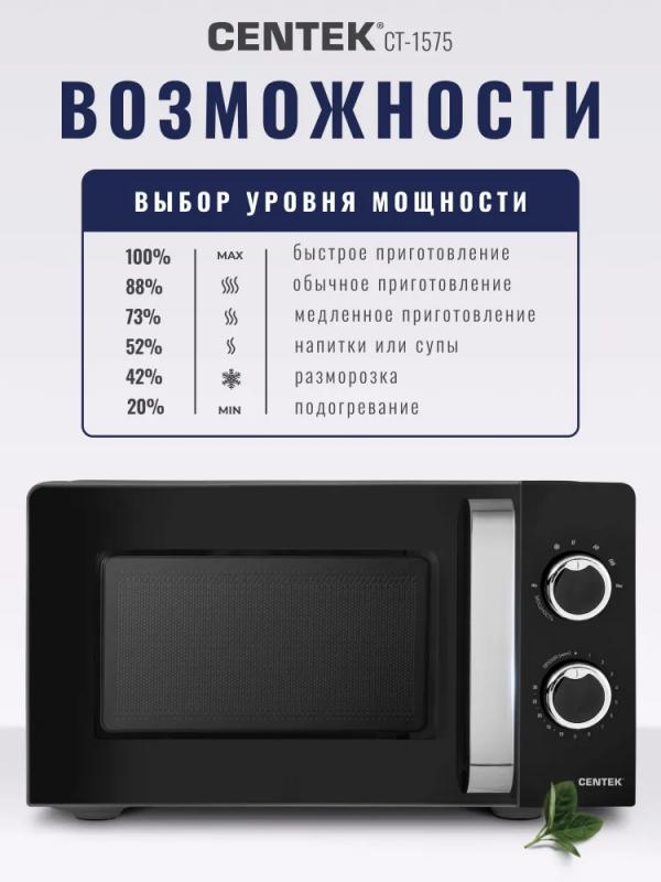 Микроволновая печь CENTEK CT-1575 — с механическим управлением, объемом 20 л и мощностью микроволн 700 Вт. Дверца открывается ручкой справа налево. Управление включает звуковой сигнал окончания работы и шесть ступеней регулировки мощности. Внутренняя камера покрыта эмалью легкой очистки, диаметр поворотного стола составляет 245 мм. Режимы: автоматическая разморозка и соло. Функция таймера отключения с максимальным временем 30 минут. Цвет корпуса — черный. Габариты: 44,6 × 24,5 × 36 см. Вес товара — 10 кг.