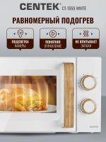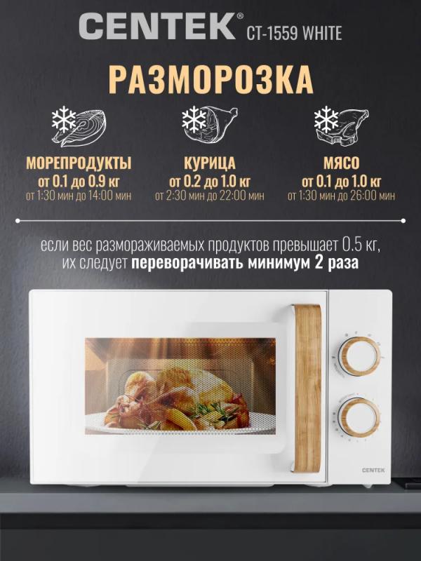 Микроволновая печь CENTEK CT-1559 — с механическим управлением, объемом 20 л и мощностью микроволн 700 Вт. Дверца открывается ручкой справа налево. Внутренняя камера покрыта эмалью. Предусмотрена регулировка мощности на шести ступенях. Режим работы — соло. Функция таймера позволяет установить время работы до 30 минут. Устройство имеет белый цвет исполнения. Габариты и вес: 48,5 × 38,5 × 29,5 см, 15,5 кг.