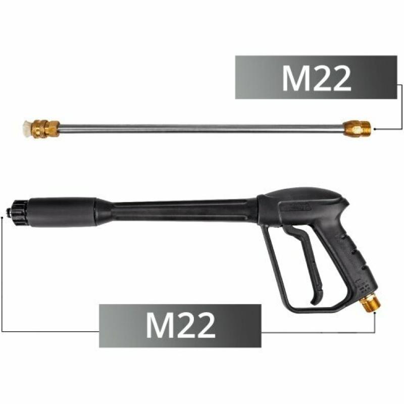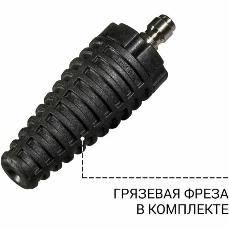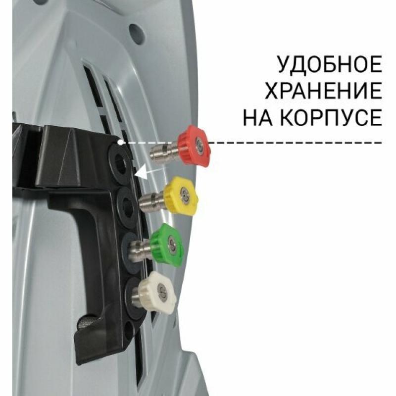 В комплект BORT KEX-3500 входят четыре насадки с разным углом распыления: 0°, 15°, 25° и 40°. Пистолет с металлическим копьем имеет защиту от случайного нажатия. Для удобства транспортировки предусмотрены большие колеса и телескопическая ручка. Дополнительно включены фильтр грубой очистки воды и система хранения насадок на корпусе.