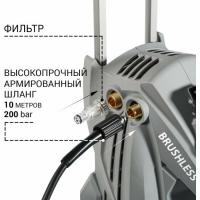 Модель оснащена комбинированной системой охлаждения. Воздушное охлаждение индукционного мотора дополняется водяным охлаждением помпы. Автоматическое отключение при перегреве защищает двигатель от повреждений. Система самовсасывания позволяет забирать воду из любых емкостей. Длина шланга высокого давления составляет 10 метров.