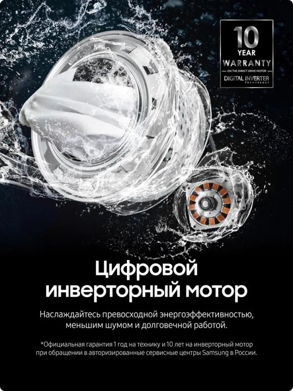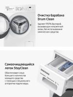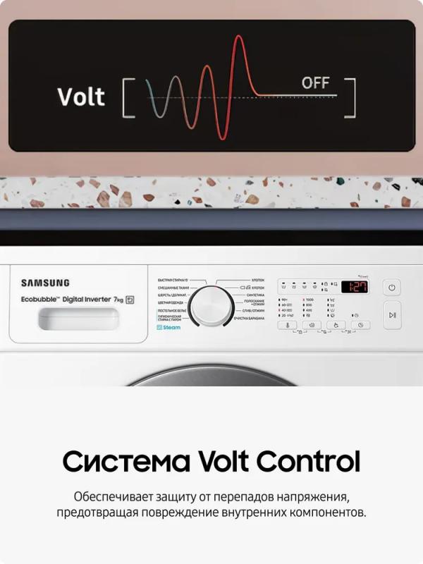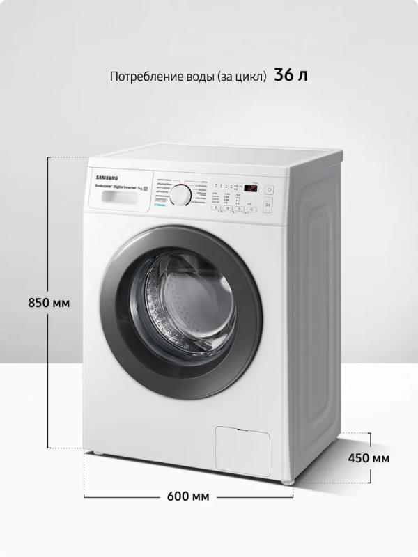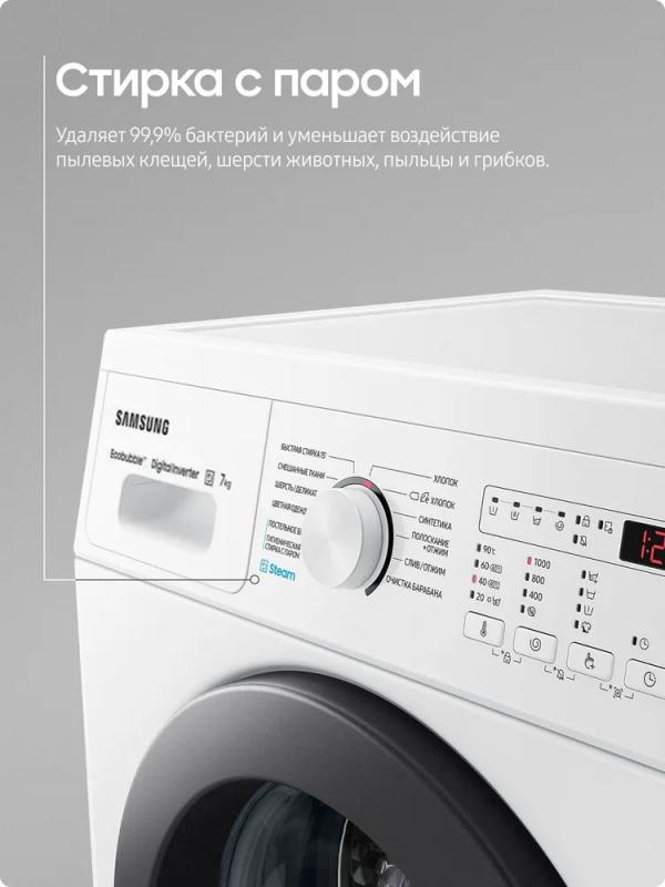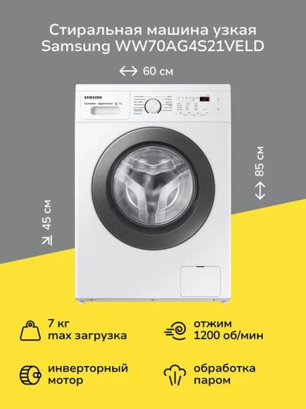 Стиральная машина Samsung WW70AG4S21VELD с инверторным мотором и цифровым дисплеем имеет максимальную загрузку 7 кг для основной стирки, 4 кг для синтетики и 2 кг для шерсти. Обеспечивает скорость отжима до 1200 об/мин при классе энергоэффективности A и классе стирки A. Расходует 1.05 кВтч электроэнергии и 42 литра воды за цикл. Уровень шума составляет 57 дБ при стирке и 75 дБ при отжиме. Включает режимы предварительной стирки, быстрой стирки за 15 минут, дополнительного полоскания, ECO, программы для разных типов тканей, очистки барабана и стирки с паром. Оснащена защитой от детей, отключением при скачках напряжения и системой самодиагностики. Имеет звуковой сигнал и индикацию режима работы. Корпус выполнен из стали белого цвета с серебристой дверцей люка. Габариты составляют 85х60х45 см, глубина с открытым люком - 95 см, вес - 51 кг.